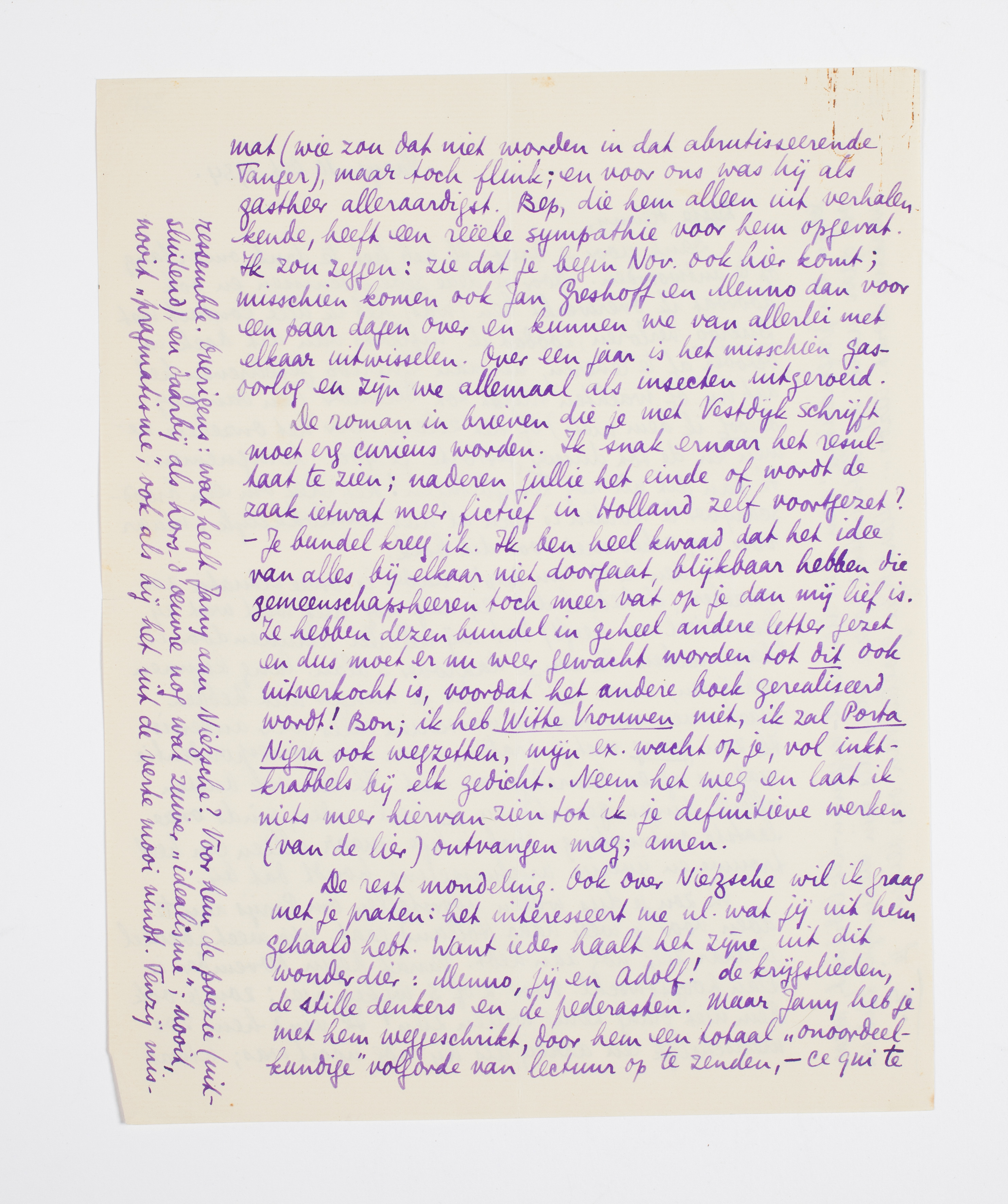 De rest mondeling. Ook over Nietzsche wil ik graag met je praten: het interesseert me nl. wat jij uit hem gehaald hebt. Want ieder haalt het zijne uit dit wonderdier: Menno, jij en Adolf! de krijgslieden, de stille denkers en de pederasten. Maar Jany heb je met hem weggeschrikt, door hem een totaal ‘onoordeelkundige’ volgorde van lectuur op te zenden, - ce qui te ressemble. Overigens: wat heeft Jany aan Nietzsche? Voor hem de poëzie (uitsluitend), en daarbij als hors-d'oeuvre nog wat zuiver ‘idealisme’; nooit, nooit ‘pragmatisme’, ook als hij het uit de verte mooi vindt. Tenzij misschien een ‘pragmatisme’ van het dier-met-2-ruggen-in-het-ledikant, maar ook daar maakt hij weer uitsluitend poëzie van, als zijn wezenlijke ziel in werking komt. Alzoo...