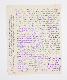 De roman in brieven die je met Vestdijk schrijft moet erg curieus worden. Ik snak ernaar het resultaat te zien; naderen jullie het einde of wordt de zaak ietwat meer fictief in Holland zelf voortgezet? - Je bundel kreeg ik. Ik ben heel kwaad dat het idee van alles bij elkaar niet doorgaat, blijkbaar hebben die gemeenschapsheeren toch meer vat op je dan mij lief is. Ze hebben dezen bundel in geheel andere letter gezet en dus moet er nu weer gewacht worden tot dit ook uitverkocht is, voordat het andere boek gerealiseerd wordt! Bon; ik heb Witte Vrouwen niet, ik zal Porta Nigra ook wegzetten, mijn ex. wacht op je, vol inktkrabbels bij elk gedicht. Neem het weg en laat ik niets meer hiervan zien tot ik je definitieve werken (van de lier) ontvangen mag; amen.