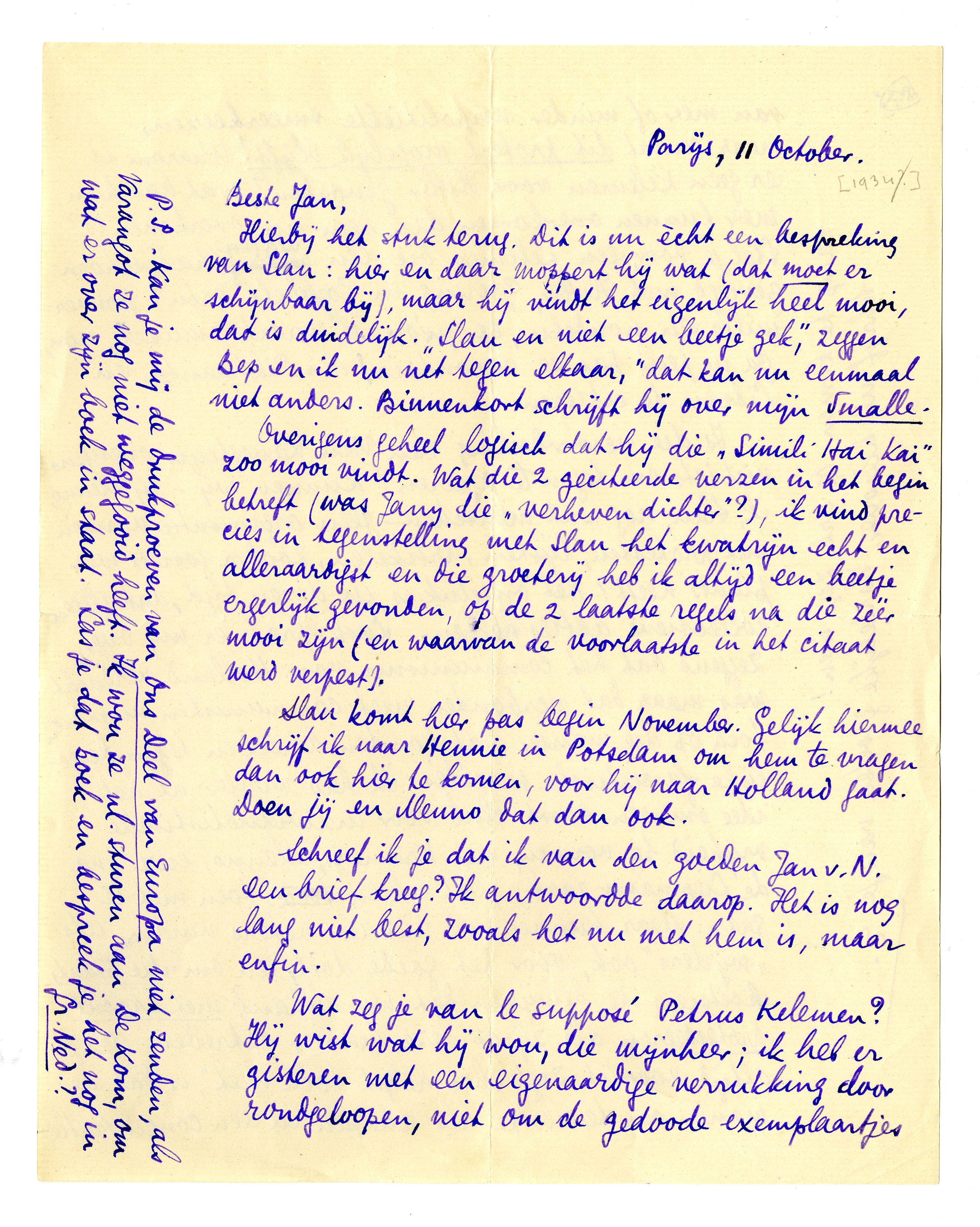 P.S. - Kan je mij de drukproeven van Ons Deel van Europa niet zenden, als Varangot ze nog niet weggegooid heeft. Ik wou ze nl. sturen aan De Kom, om wat er over zijn boek in staat. Las je dat boek en bespreek je het nog in Gr. Ned.?