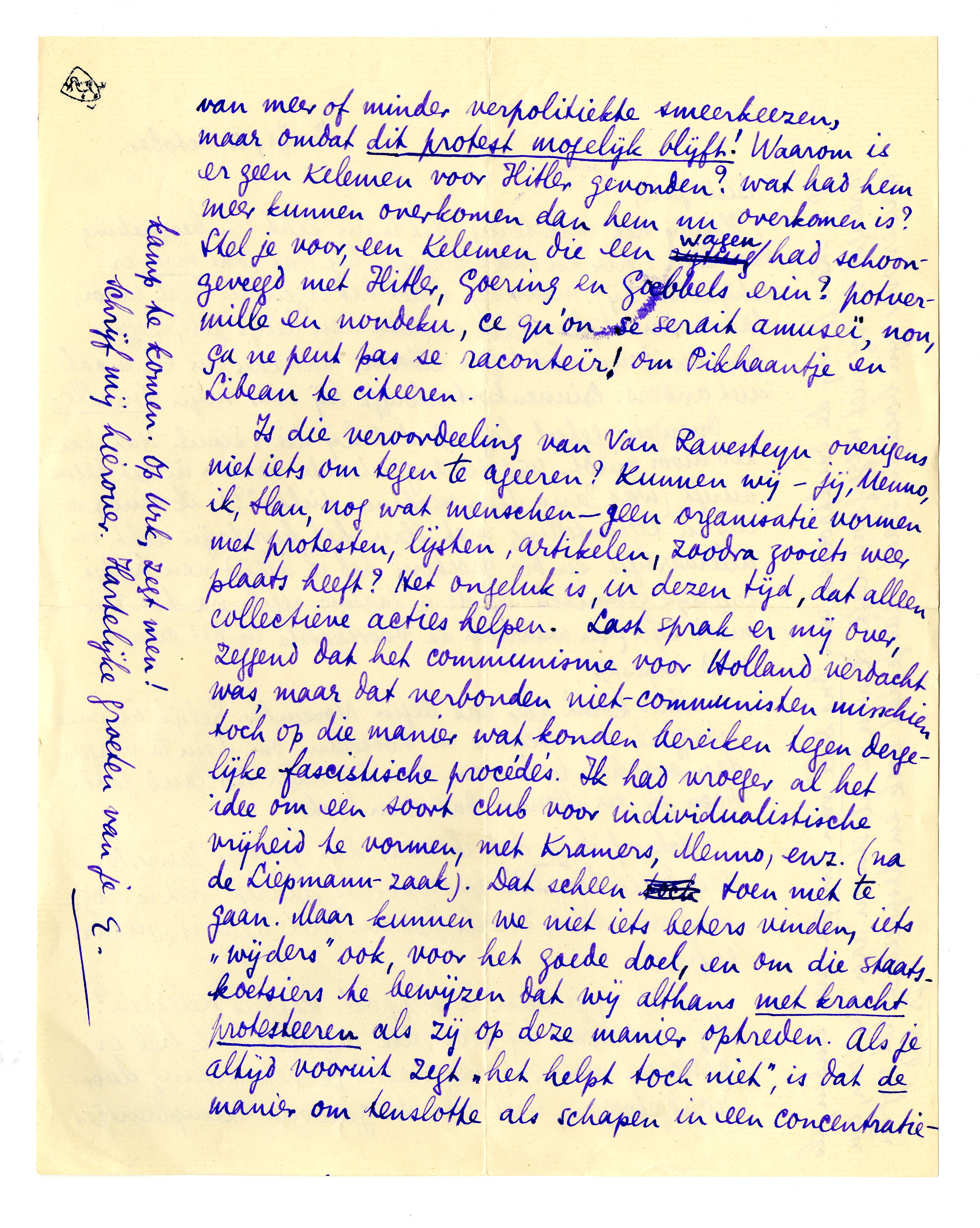 Is die veroordeeling van Van Ravesteyn3368 overigens niet iets om tegen te ageeren? Kunnen wij - jij, Menno, ik, Slau, nog wat menschen - geen organisatie vormen met protesten, lijsten, artikelen, zoodra zooiets weer plaats heeft? Het ongeluk is, in dezen tijd, dat alleen collectieve acties helpen. Last sprak er mij over, zeggend dat het communisme voor Holland verdacht was, maar dat verbonden niet-communisten misschien toch op die manier wat konden bereiken tegen dergelijke fascistische procédés. Ik had vroeger al het idee om een soort club voor individualistische vrijheid te vormen, met Kramers, Menno, enz. (na de Liepmann-zaak). Dat scheen toen niet te gaan. Maar kunnen we niet iets beters vinden, iets ‘wijders’ ook, voor het goede doel, en om die staatskoetsiers te bewijzen dat wij althans met kracht protesteeren als zij op deze manier optreden. Als je altijd vooruit zegt ‘het helpt toch niet’, is dat de manier om tenslotte als schapen in een concentratiekamp te komen. Op Urk, zegt men!
