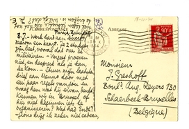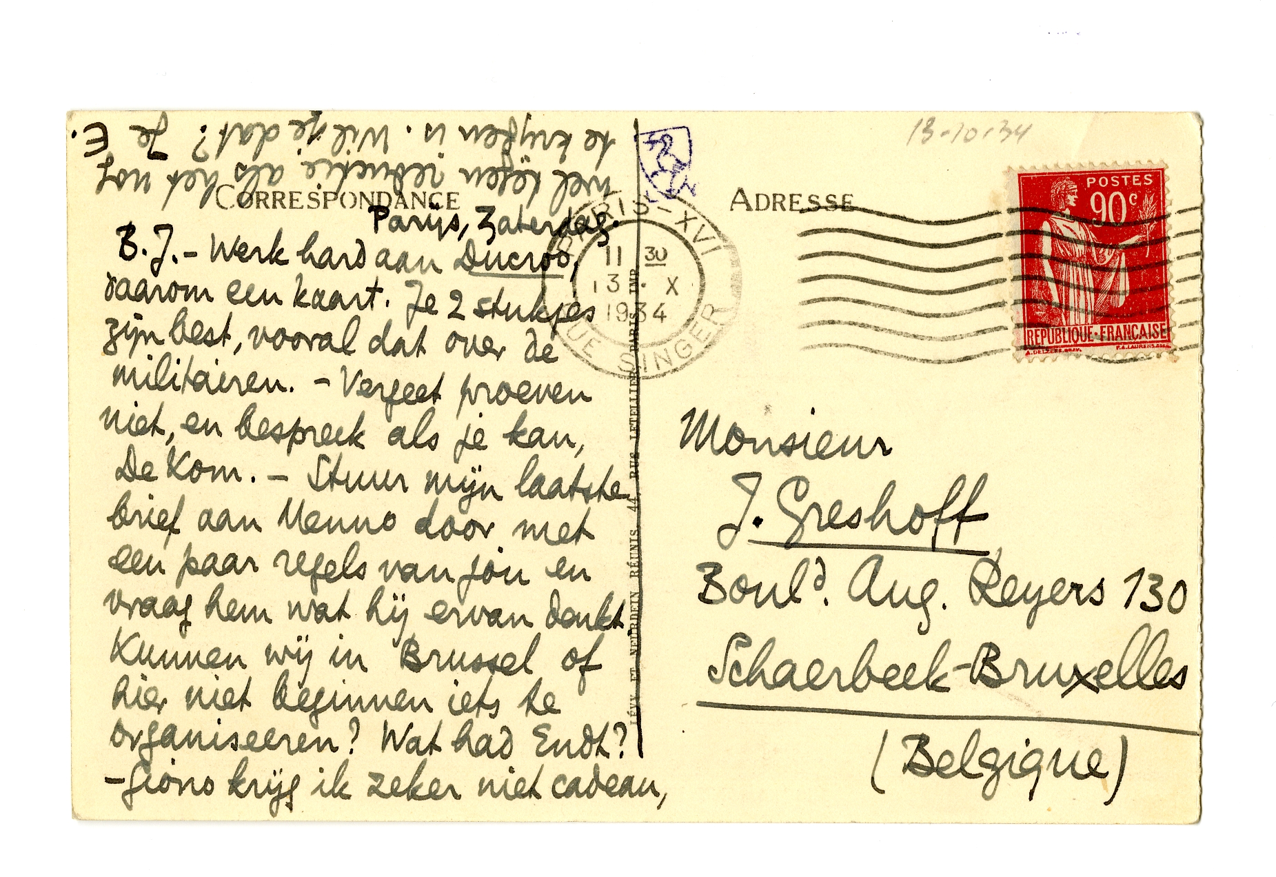 B.J. - Werk hard aan Ducroo, daarom een kaart. Je 2 stukjes3370 zijn best, vooral dat over de militairen. - Vergeet proeven niet, en bespreek als je kan, De Kom.3371 - Stuur mijn laatste brief aan Menno3372 door met een paar regels van jou en vraag hem wat hij ervan denkt. Kunnen wij in Brussel of hier niet beginnen iets te organiseren? Wat had Endt? - Giono3373 krijg ik zeker niet cadeau, wel tegen reductie als het nog te krijgen is. Wil je dat?