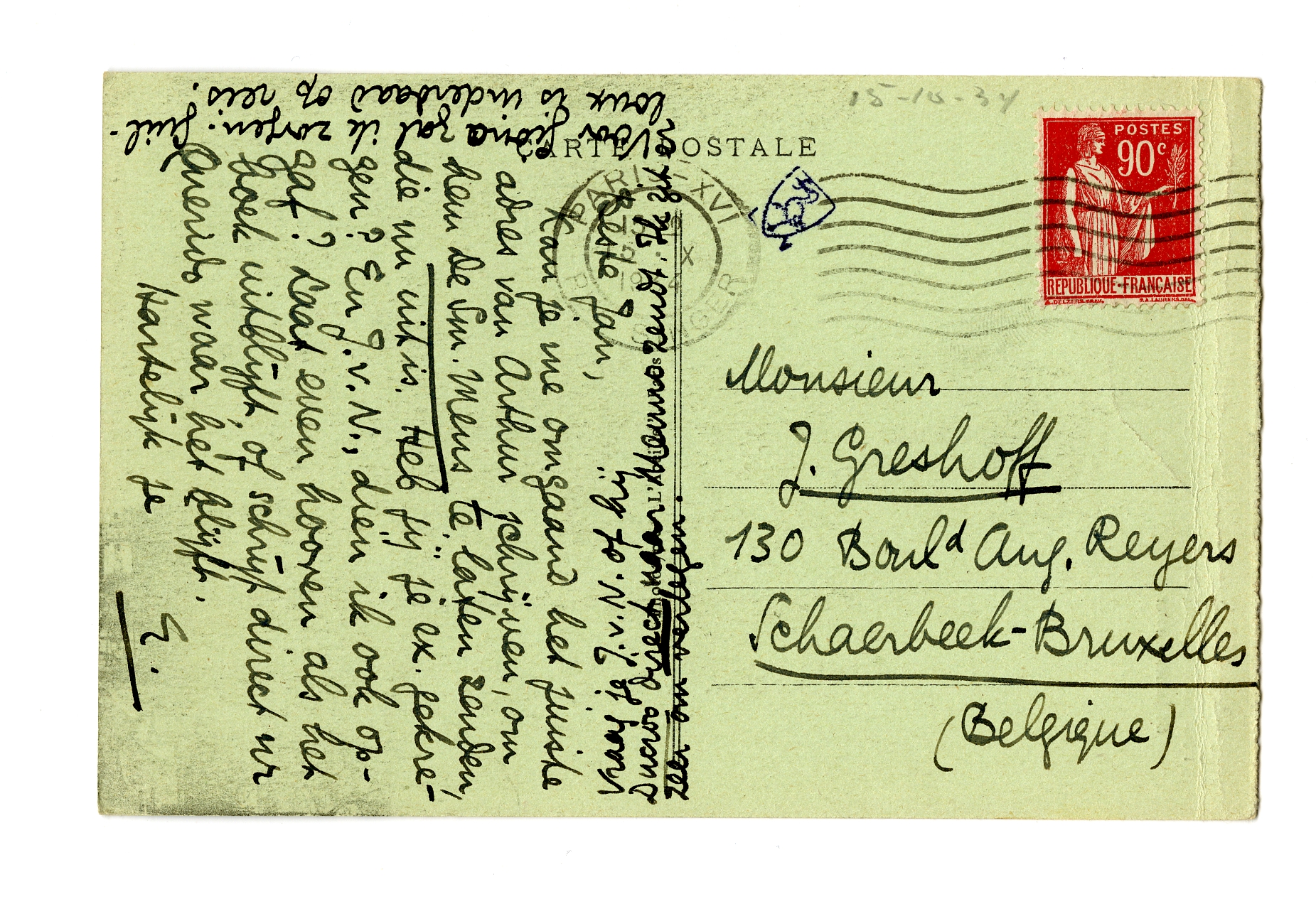 Kan je me omgaand het juiste adres van Arthur schrijven, om hem De Sm. Mens te laten zenden, die nu uit is. Heb jij je ex. gekregen? En J.v.N., dien ik ook opgaf? Laat even hooren als het boek uitblijft, of schrijf direct nr Querido waar het blijft.