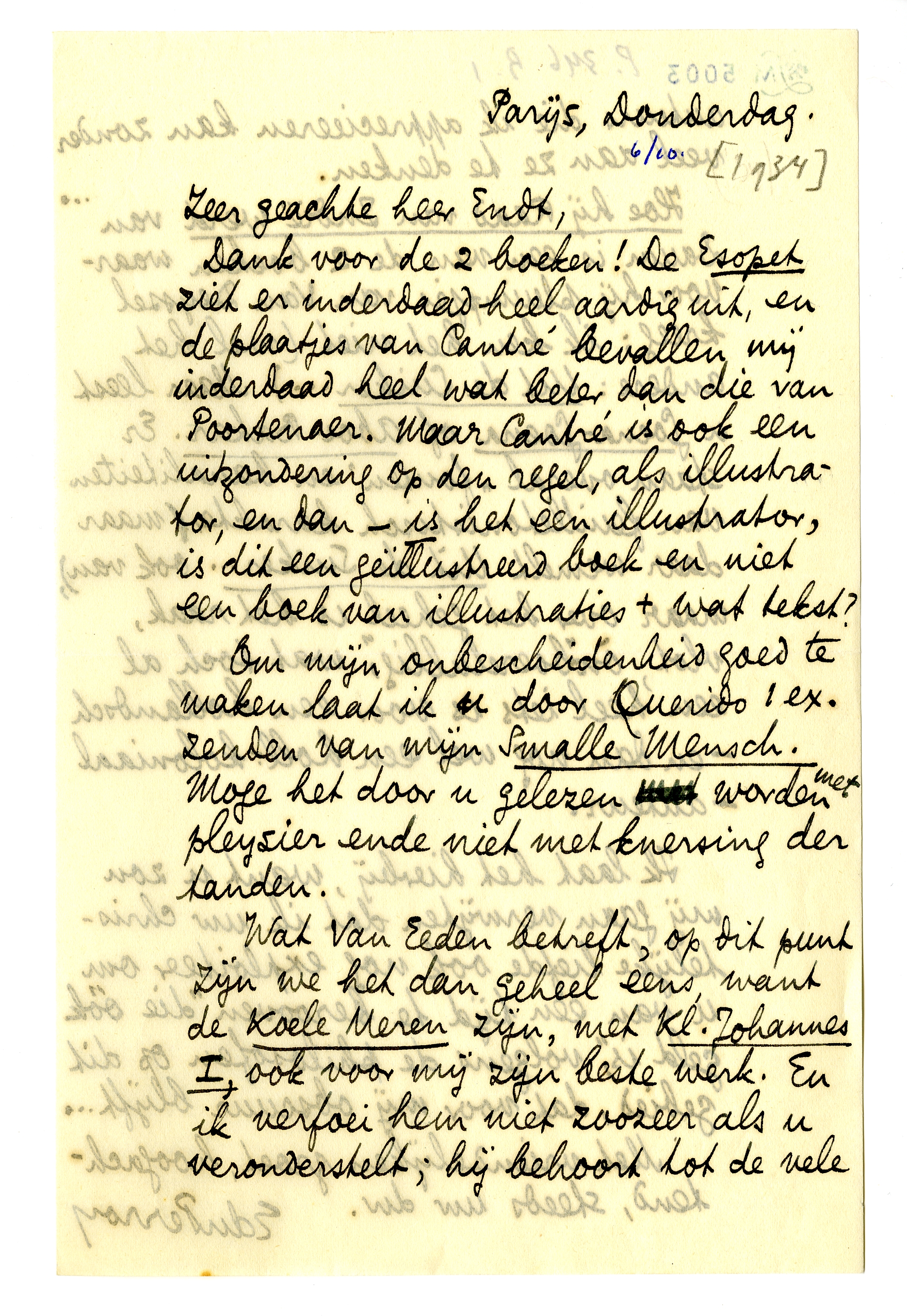 Om mijn onbescheidenheid goed te maken laat ik door Querido 1 ex. zenden van mijn Smalle Mensch. Moge het door u gelezen worden met pleysier ende niet met knersing der tanden.