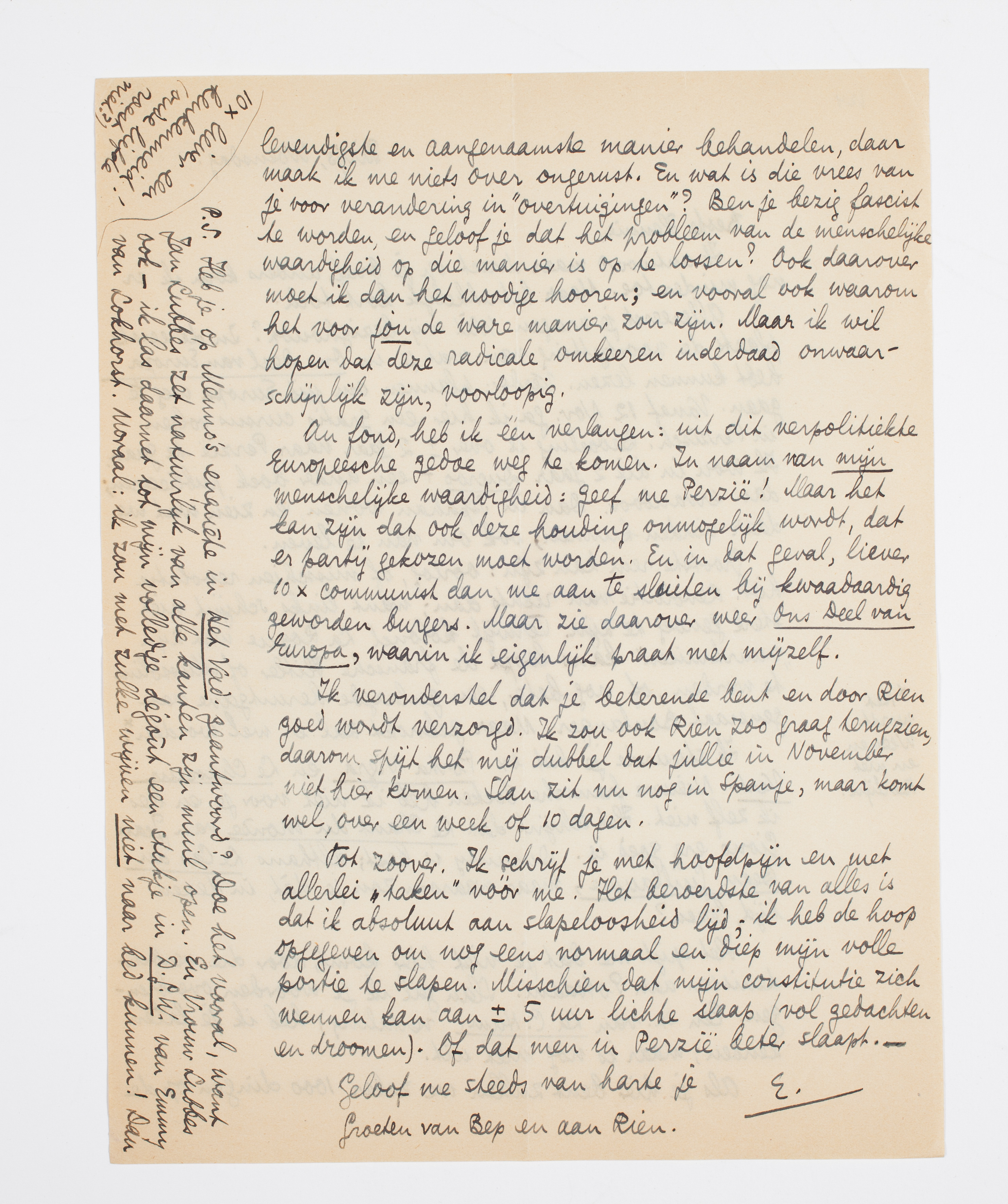 Als je hier bent zullen we zeker 1000 dingen op de levendigste en aangenaamste manier behandelen, daar maak ik me niets over ongerust. En wat is die vrees van je voor verandering in ‘overtuigingen’? Ben je bezig fascist te worden, en geloof je dat het probleem van de menschelijke waardigheid op die manier is op te lossen? Ook daar-over moet ik dan het noodige hooren; en vooral ook waarom het voor jou de ware manier zou zijn. Maar ik wil hopen dat deze radicale omkeeren inderdaad onwaarschijnlijk zijn, voorloopig.
