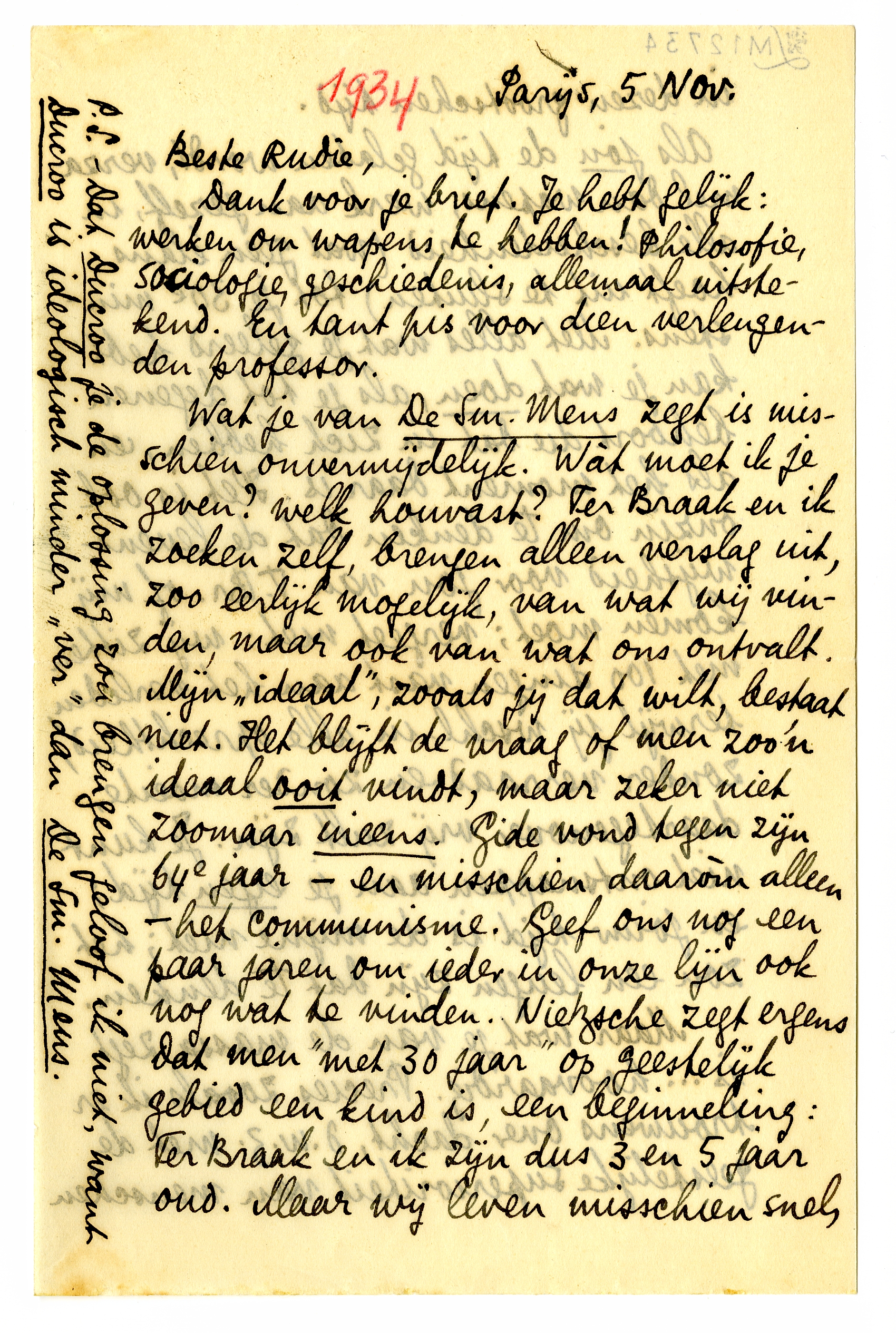 Dank voor je brief. Je hebt gelijk: werken om wapens te hebben! Philosofie, sociologie, geschiedenis, allemaal uitstekend. En tant pis voor dien verleugenden professor.3409