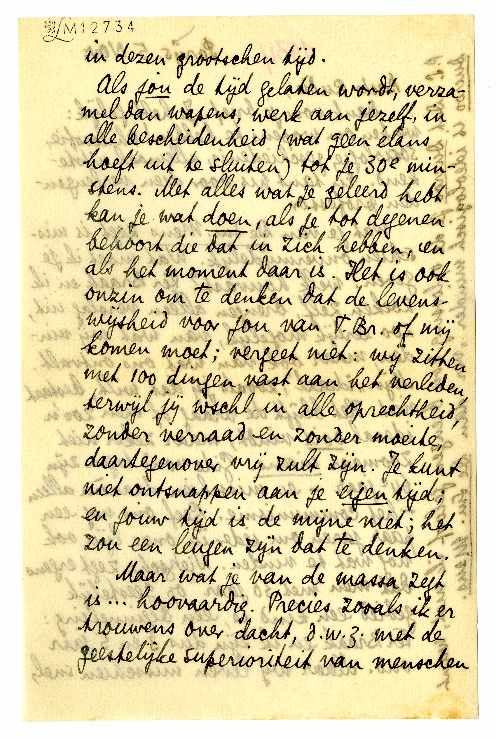 Als jou de tijd gelaten wordt, verzamel dan wapens, werk aan jezelf, in alle bescheidenheid (wat geen élans hoeft uit te sluiten) tot je 30e minstens. Met alles wat je geleerd hebt kan je wat doen, als je tot degenen behoort die dat in zich hebben, en als het moment daar is. Het is ook onzin om te denken dat de levenswijsheid voor jou van T. Br. of mij komen moet; vergeet nièt: wij zitten met 100 dingen vast aan het verleden, terwijl jij wschl. in alle oprechtheid, zonder verraad en zonder moeite, daartegenover vrij zult zijn. Je kunt niet ontsnappen aan je eigen tijd; en jouw tijd is de mijne niet; het zou een leugen zijn dat te denken.
