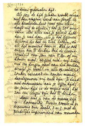 Wat je van De Sm. Mens zegt is misschien onvermijdelijk. Wàt moet ik je geven? welk houvast? Ter Braak en ik zoeken zelf, brengen alleen verslag uit, zoo eerlijk mogelijk, van wat wij vinden, maar ook van wat ons ontvalt. Mijn ‘ideaal’, zoals jij dat wilt, bestaat niet. Het blijft de vraag of men zoo'n ideaal ooit vindt, maar zeker niet zoomaar ineens. Gide vond tegen zijn 64e jaar - en misschien daaròm alleen - het communisme. Geef ons nog een paar jaren om ieder in onze lijn ook nog wat te vinden. Nietzsche zegt ergens dat men ‘met 30 jaar’ op geestelijk gebied een kind is, een beginneling: Ter Braak en ik zijn dus 3 en 5 jaar oud. Maar wij leven misschien snel, in dezen grootschen tijd.