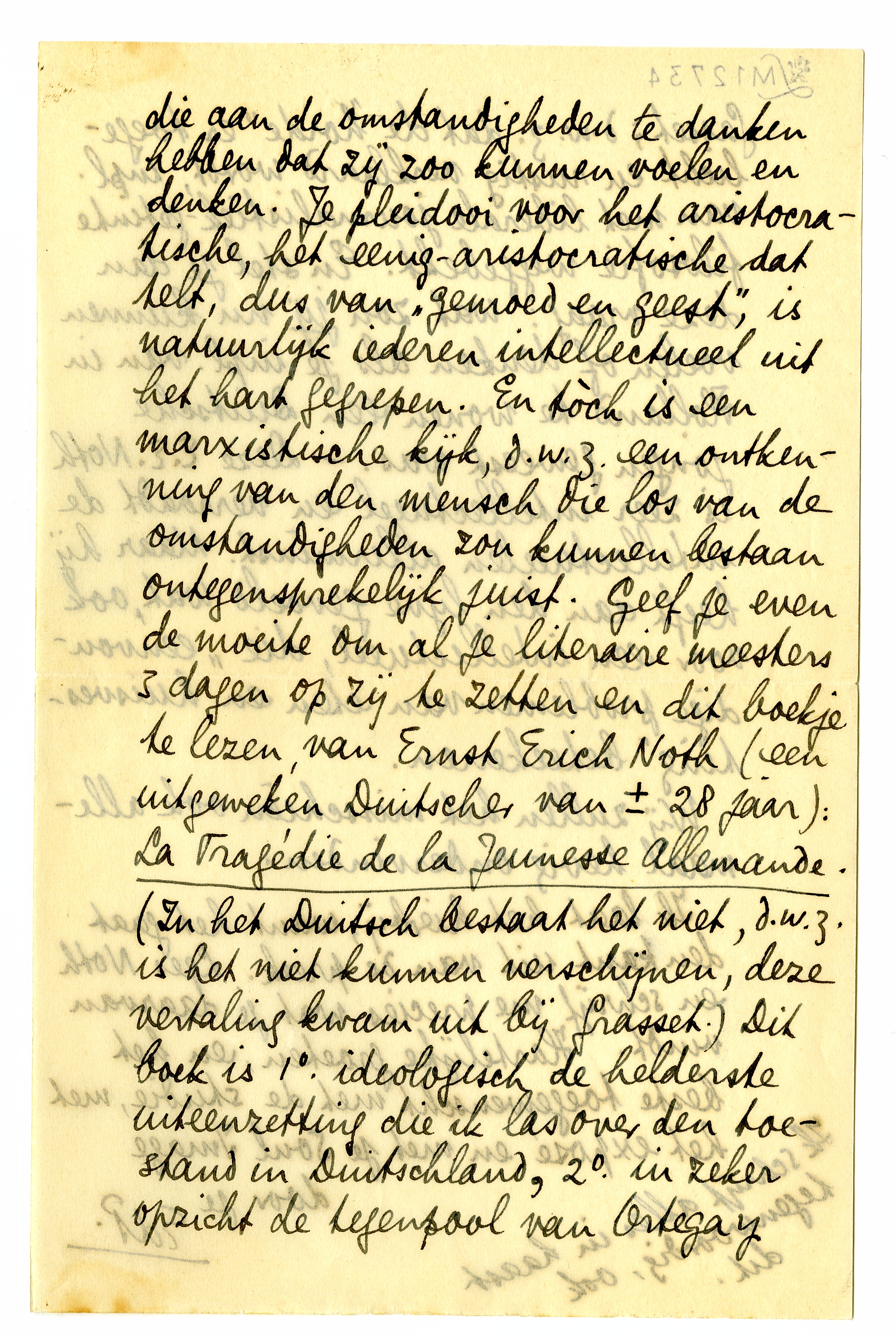 Maar wat je van de massa zegt is... hoovaardig. Precies zoals ik er trouwens over dacht, d.w.z. met de geestelijke superioriteit van menschen die aan de omstandigheden te danken hebben dat zij zoo kunnen voelen en denken. Je pleidooi voor het aristocratische, het eenig-aristocratische dat telt, dus van ‘gemoed en geest’, is natuurlijk iederen intellectueel uit het hart gegrepen. En tòch is een marxistische kijk, d.w.z. een ontkenning van den mensch die los van de omstandigheden zou kunnen bestaan ontegensprekelijk juist. Geef je even de moeite om al je literaire meesters 3 dagen op zij te zetten en dit boekje te lezen, van Ernst Erich Noth (een uitgeweken Duitscher van ± 28 jaar): La Tragédie de la Jeunesse Allemande. (In het Duitsch bestaat het niet, d.w.z. is het niet kunnen verschijnen, deze vertaling kwam uit bij Grasset.) Dit boek is 1o. ideologisch de helderste uiteenzetting die ik las over den toestand in Duitschland, 2o. in zeker opzicht de tegenpool van Ortega y Gasset; d.w.z. dat de ‘horde’ er toegelicht en rustig verklaard wordt, inpl. van met liberale journalistiek-getinte filosofie weggebekt. En stel je dan deze vraag: wat zou jij nu kunnen voelen of denken als je inpl. van in Holland te wonen een Duitsche jongen geweest was. - Deze E.E. Noth is zeer intellectueel en verraadt de intellectueelen allerminst. Maar hij heeft aan den lijve gevoeld wat, ook voor een intellectueel, die ‘eenvoudige problemen van eten en huisvesting’ beteekenen.