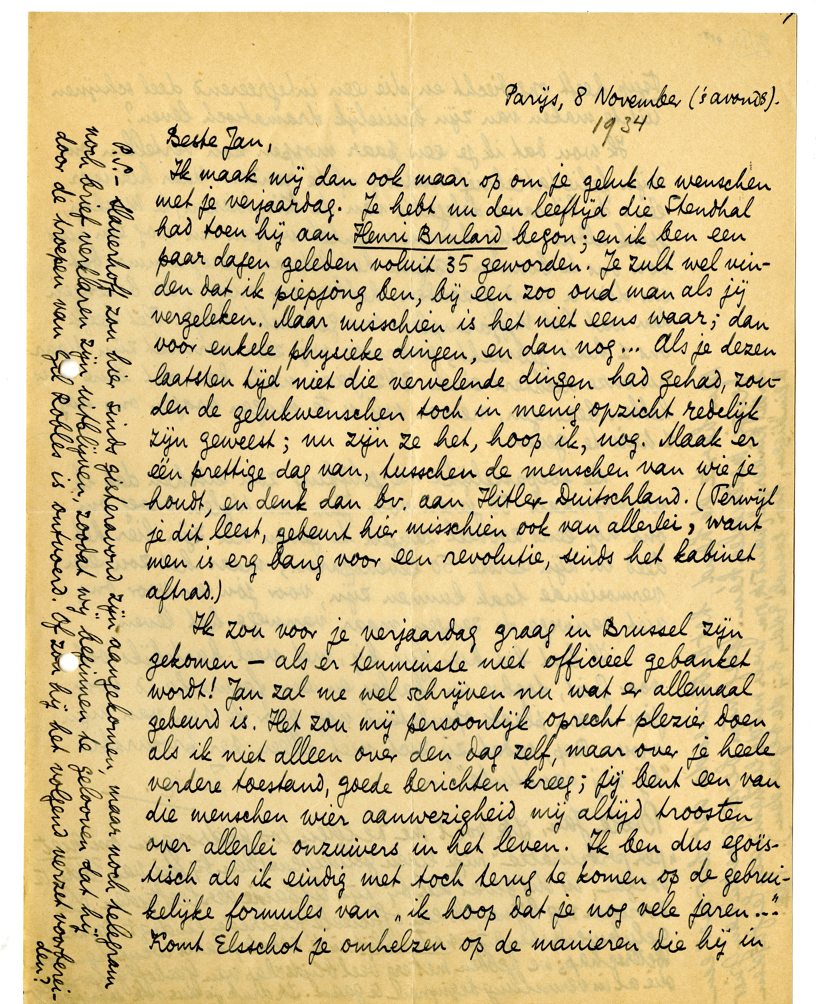 Ik maak mij dan ook maar op om je geluk te wenschen met je verjaardag.3421 Je hebt nu den leeftijd die Stendhal had toen hij aan Henri Brulard begon; en ik ben een paar dagen geleden voluit 35 geworden. Je zult wel vinden dat ik piepjong ben, bij een zoo oud man als jij vergeleken. Maar misschien is het niet eens waar; dan voor enkele physieke dingen, en dan nog... Als je dezen laatsten tijd niet die vervelende dingen had gehad, zouden de gelukwenschen toch in menig opzicht redelijk zijn geweest; nu zijn ze het, hoop ik, nog. Maak er één prettige dag van, tusschen de menschen van wie je houdt, en denk dan bv. aan Hitler-Duitschland. (Terwijl je dit leest, gebeurt hier misschien ook van allerlei, want men is erg bang voor een revolutie, sinds het kabinet aftrad.)3422