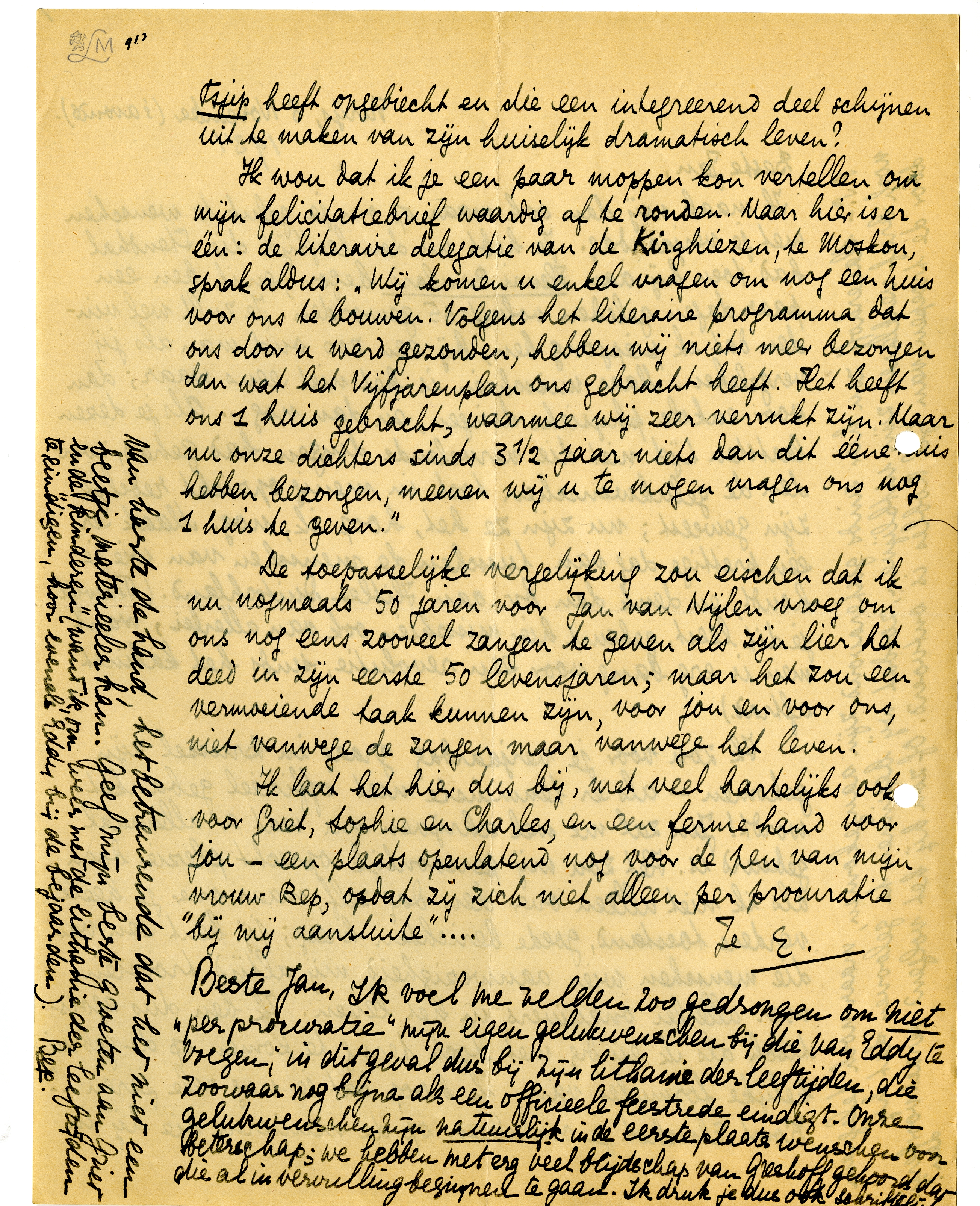 Ik laat het hier dus bij, met veel hartelijks ook voor Griet, Sophie en Charles, en een ferme hand voor jou - een plaats openlatend nog voor de pen van mijn vrouw Bep, opdat zij zich niet alleen per procuratie ‘bij mij aansluite’...