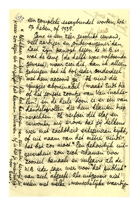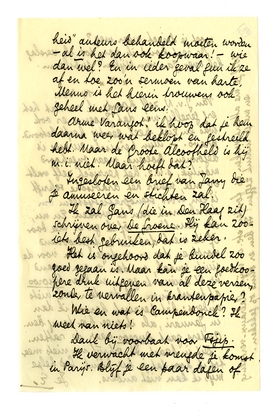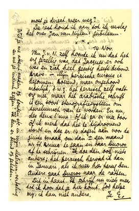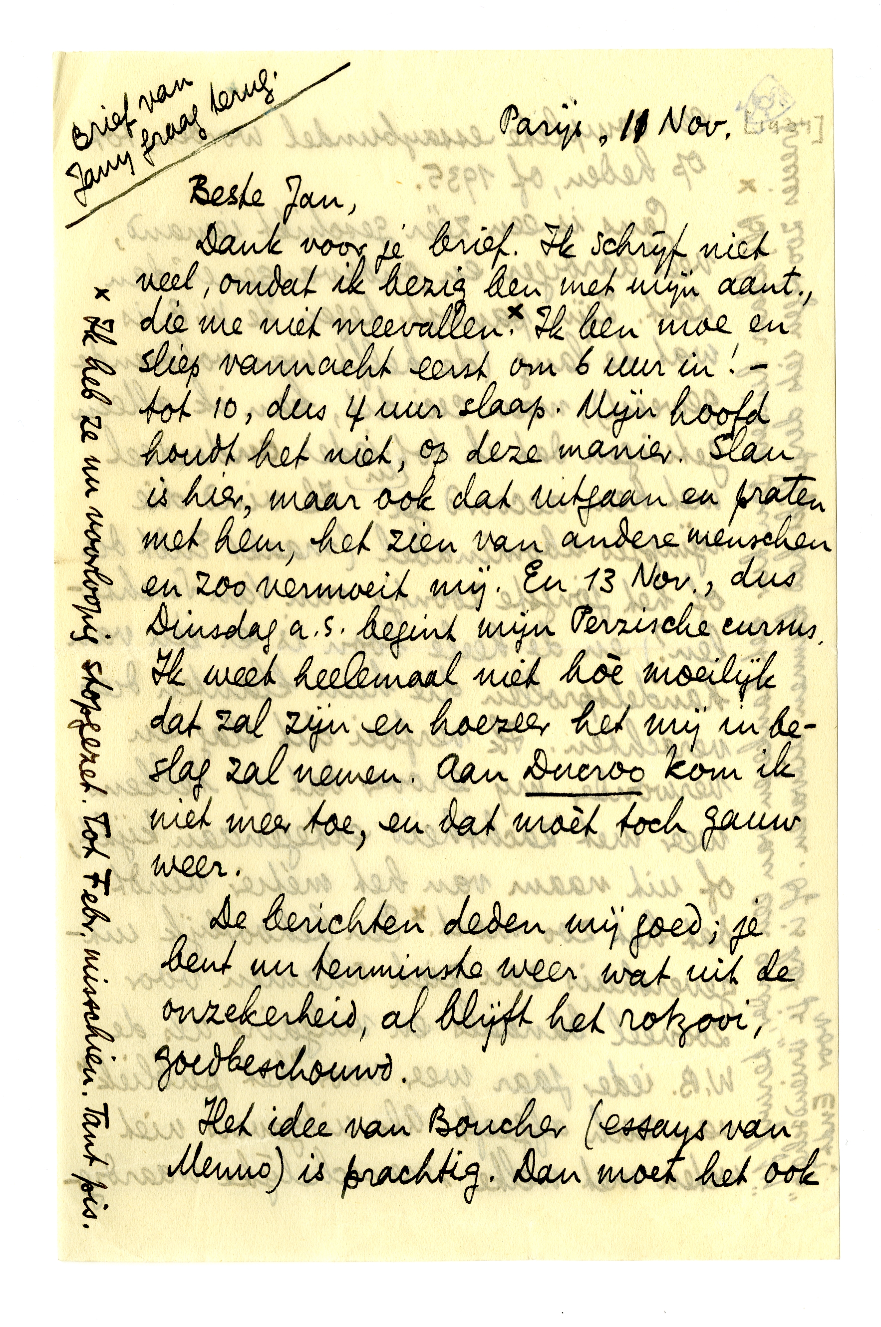 Dank voor je brief. Ik schrijf niet veel, omdat ik bezig ben met mijn aant., die me niet meevallen.* Ik ben moe en sliep vannacht eerst om 6 uur in! - tot 10, dus 4 uur slaap. Mijn hoofd houdt het niet, op deze manier. Slau is hier, maar ook dat uitgaan en praten met hem, het zien van andere menschen en zoo vermoeit mij. En 13 Nov., dus Dinsdag a.s. begint mijn Perzische cursus. Ik weet heelemaal niet hoè moeilijk dat zal zijn en hoezeer het mij in beslag zal nemen. Aan Ducroo kom ik niet meer toe, en dat moèt toch gauw weer.