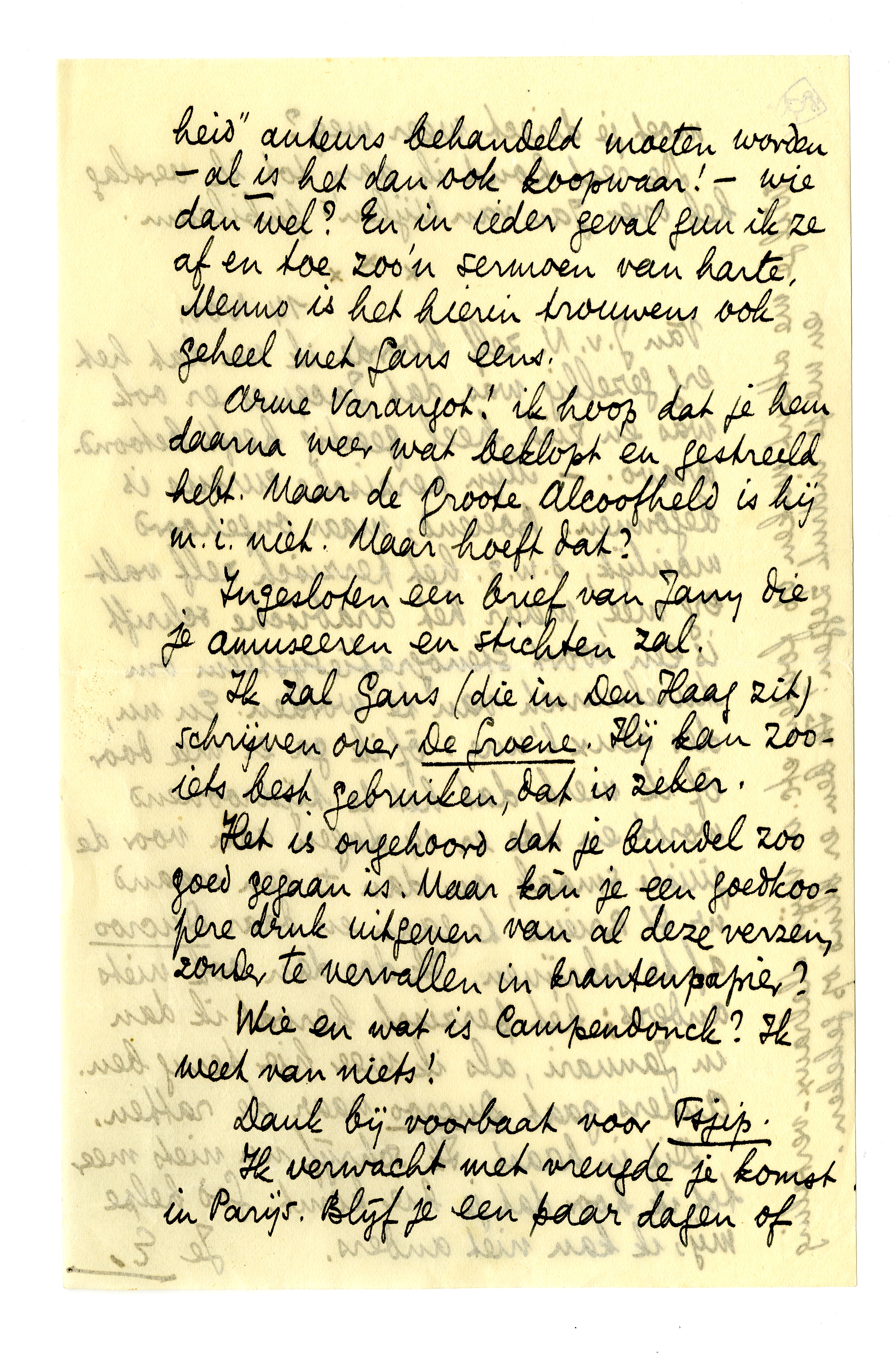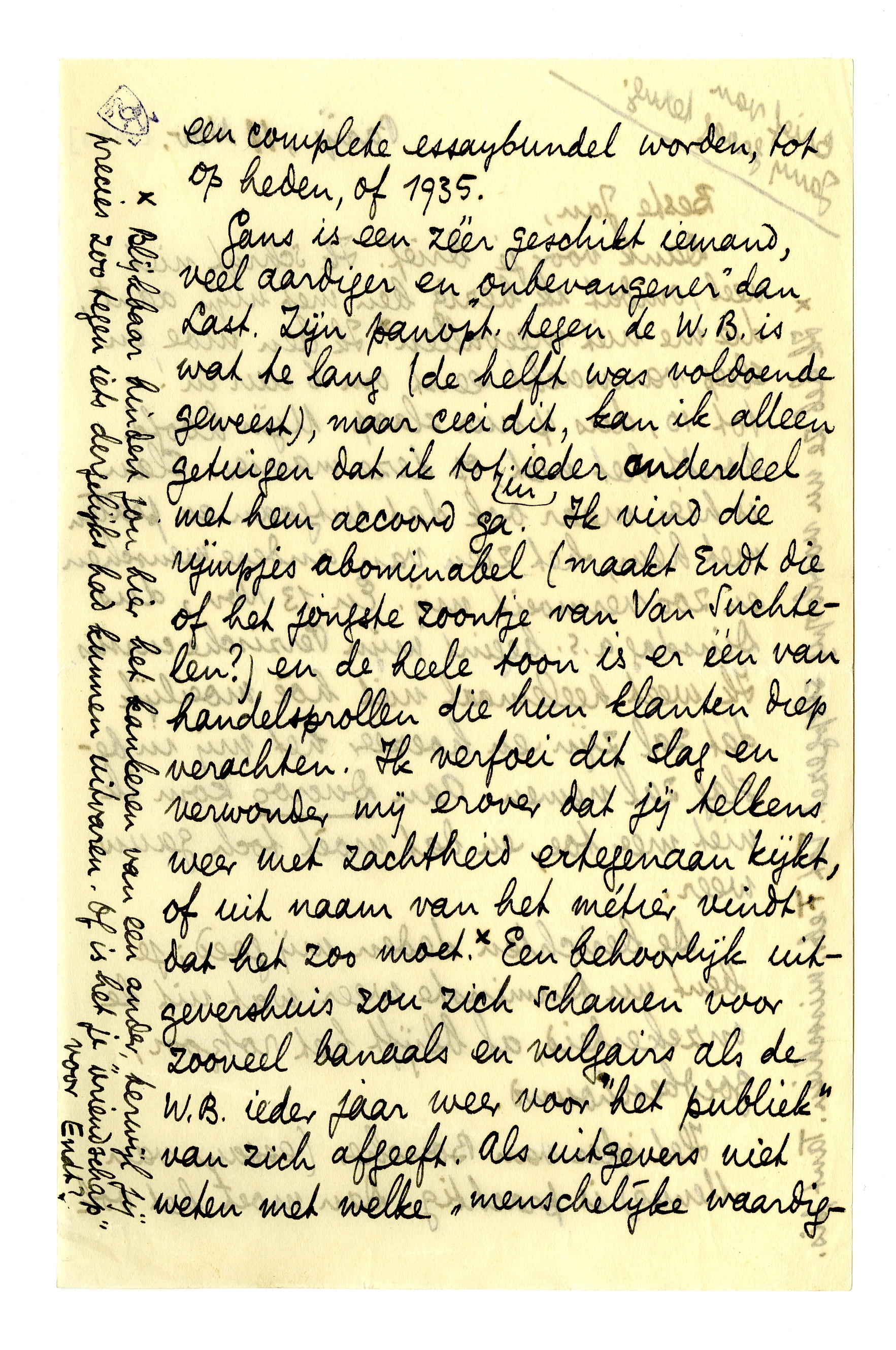 Gans is een zéér geschikt iemand, veel aardiger en ‘onbevangener’ dan Last. Zijn panopt. tegen de W.B.3438 is wat te lang (de helft was vol-doende geweest), maar ceci dit, kan ik alleen getuigen dat ik tot in ieder onderdeel met hem accoord ga. Ik vind die rijmpjes abominabel (maakt Endt die of het jongste zoontje van Van Suchtelen?) en de heele toon is er één van handelsprollen die hun klanten diep verachten. Ik verfoei dit slag en verwonder mij erover dat jij telkens weer met zachtheid ertegenaan kijkt, of uit naam van het métier vindt dat het zoo moet.* Een behoorlijk uitgevershuis zou zich schamen voor zooveel banaals en vulgairs als de W.B. ieder jaar weer voor ‘het publiek’ van zich afgeeft. Als uitgevers niet weten met welke ‘menschelijke waardigheid’ auteurs behandeld moeten worden - al is het dan ook koopwaar! - wie dan wel? En in ieder geval gun ik ze af en toe zoo'n sermoen van harte, Menno is het hierin trouwens ook geheel met Gans eens.