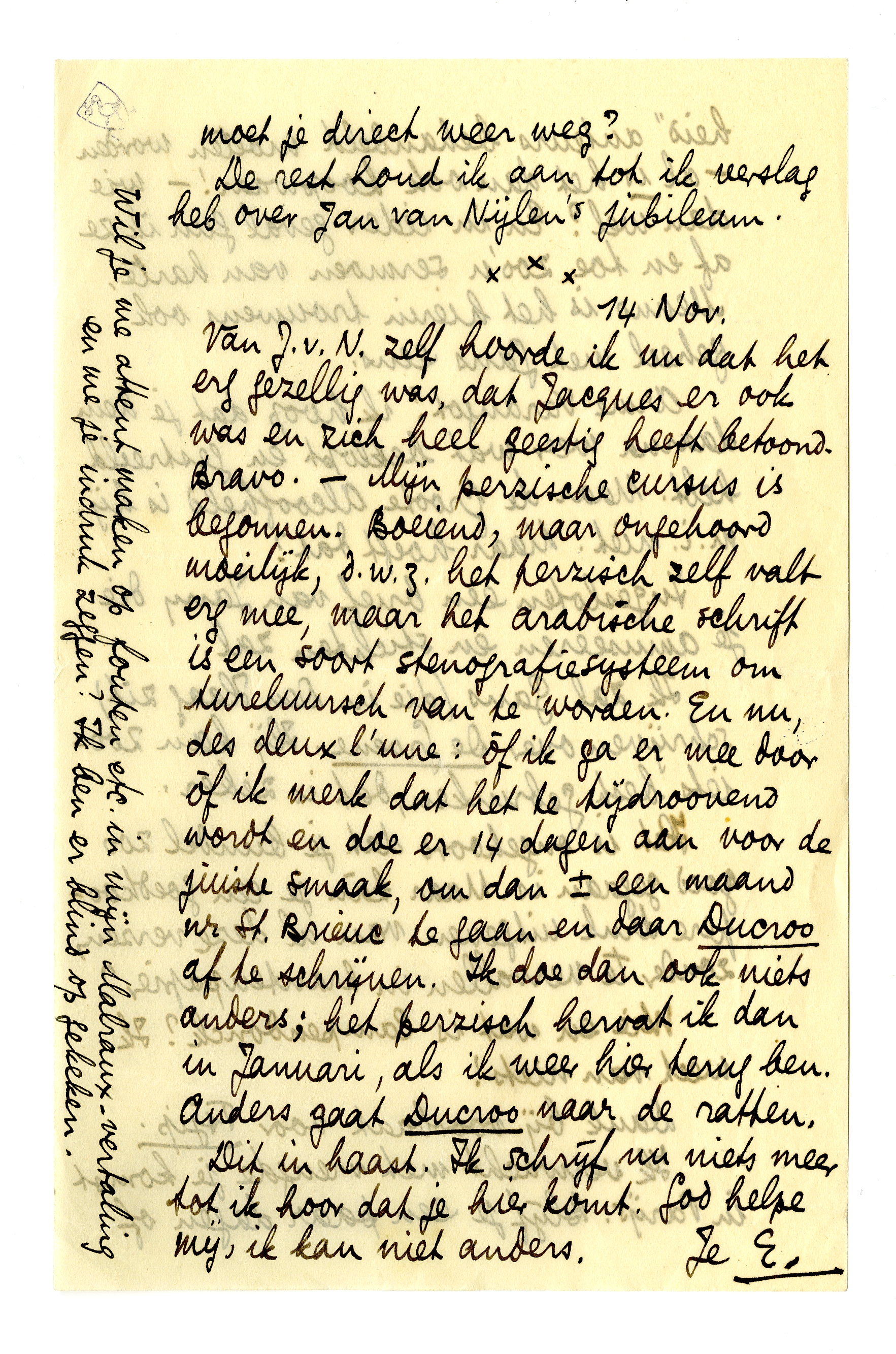 Van J.v.N. zelf hoorde ik nu dat het erg gezellig was, dat Jacques er ook was en zich heel geestig heeft betoond Bravo. - Mijn perzische cursus is begonnen. Boeiend, maar ongehoord moeilijk, d.w.z. het perzisch zelf valt erg mee, maar het arabische schrift is een soort stenografiesysteem om tureluursch van te worden. En nu, des deux l'une: òf ik ga er mee door òf ik merk dat het te tijdroovend wordt en doe er 14 dagen aan voor de juiste smaak, om dan ± een maand nr St. Brieuc te gaan en daar Ducroo af te schrijven. Ik doe dan ook niets anders; het perzisch hervat ik dan in Januari, als ik weer hier terug ben. Anders gaat Ducroo naar de ratten.