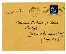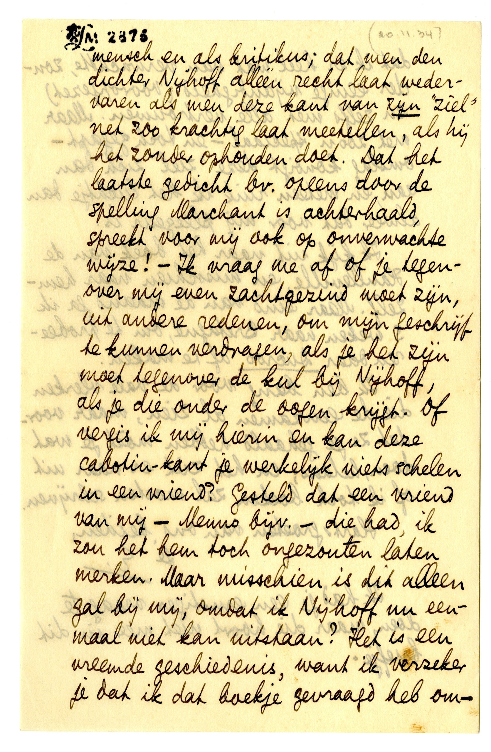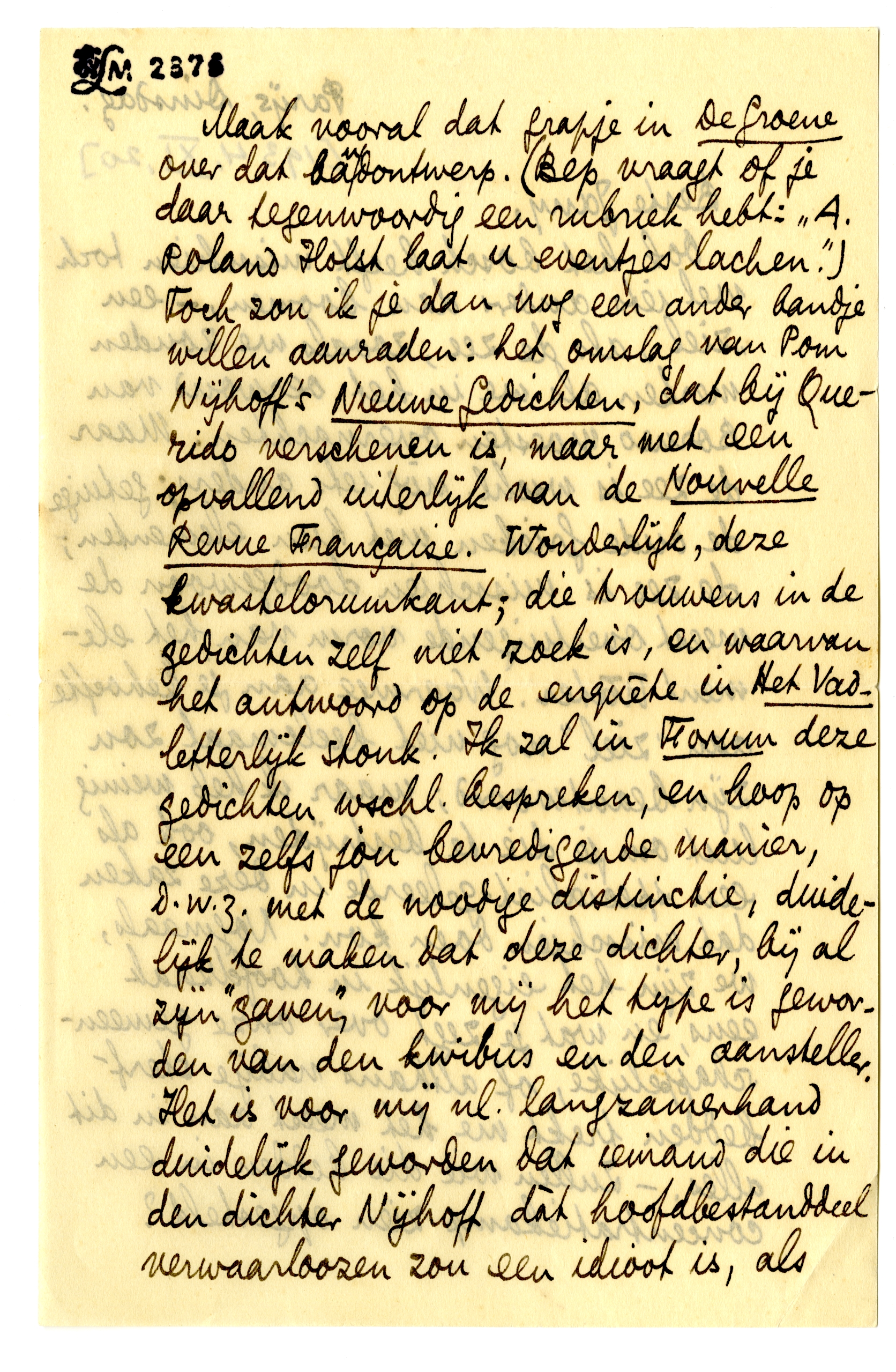 Maak vooral dat grapje in De Groene over dat bandontwerp. (Bep vraagt of je daar tegenwoordig een rubriek3449 hebt: ‘A. Roland Holst laat u eventjes lachen.’) Toch zou ik je dan nog een ander bandje willen aanraden: het omslag van Pom Nijhoff's Nieuwe Gedichten, dat bij Querido verschenen is, maar met een opvallend uiterlijk van de Nouvelle Revue Française. Wonderlijk, deze kwastelorumkant; die trouwens in de gedichten zelf niet zoek is, en waarvan het antwoord op de enquête in Het Vad. letterlijk stonk. Ik zal in Forum deze gedichten wschl. bespreken, en hoop op een zelfs jou bevredigende manier, d.w.z. met de noodige distinctie, duidelijk te maken dat deze dichter, bij al zijn ‘gaven’, voor mij het type is geworden van den kwibus en den aansteller.3450 Het is voor mij nl. langzamerhand duidelijk geworden dat iemand die in den dichter Nijhoff dàt hoofdbestanddeel verwaarloozen zou een idioot is, als mensch en als kritikus; dat men den dichter Nijhoff alléén recht laat wedervaren als men deze kant van zijn ‘ziel’ net zoo krachtig laat meetellen, als hij het zonder ophouden doet. Dat het laatste gedicht bv. opeens door de spelling Marchant is achterhaald, spreekt voor mij ook op onverwachte wijze!3451 - Ik vraag me af of je tegenover mij even zachtgezind moet zijn, uit andere redenen, om mijn geschrijf te kunnen verdragen, als je het zijn moet tegenover de kul bij Nijhoff, als je die onder de oogen krijgt. Of vergis ik mij hierin en kan deze cabotin-kant je werkelijk niets schelen in een vriend? Gesteld dat een vriend van mij - Menno bijv. - die had, ik zou het hem toch ongezouten laten merken. Maar misschien is dit alleen gal bij mij, omdat ik Nijhoff nu eenmaal niet kan uitstaan? Het is een vreemde geschiedenis, want ik verzeker je dat ik dat boekje gevraagd heb omdat ik er heel wat van verwachtte, zonder eenige vijandigheid (vooropgezet) en zelfs met alle vertrouwen. Maar met zoo'n speciaal - en toch gegapt - omslag kondigt deze ‘ziel’ zich dan aan, en meteen ruik ik het luchtje dan alweer dat voor mij pleegeur is.