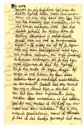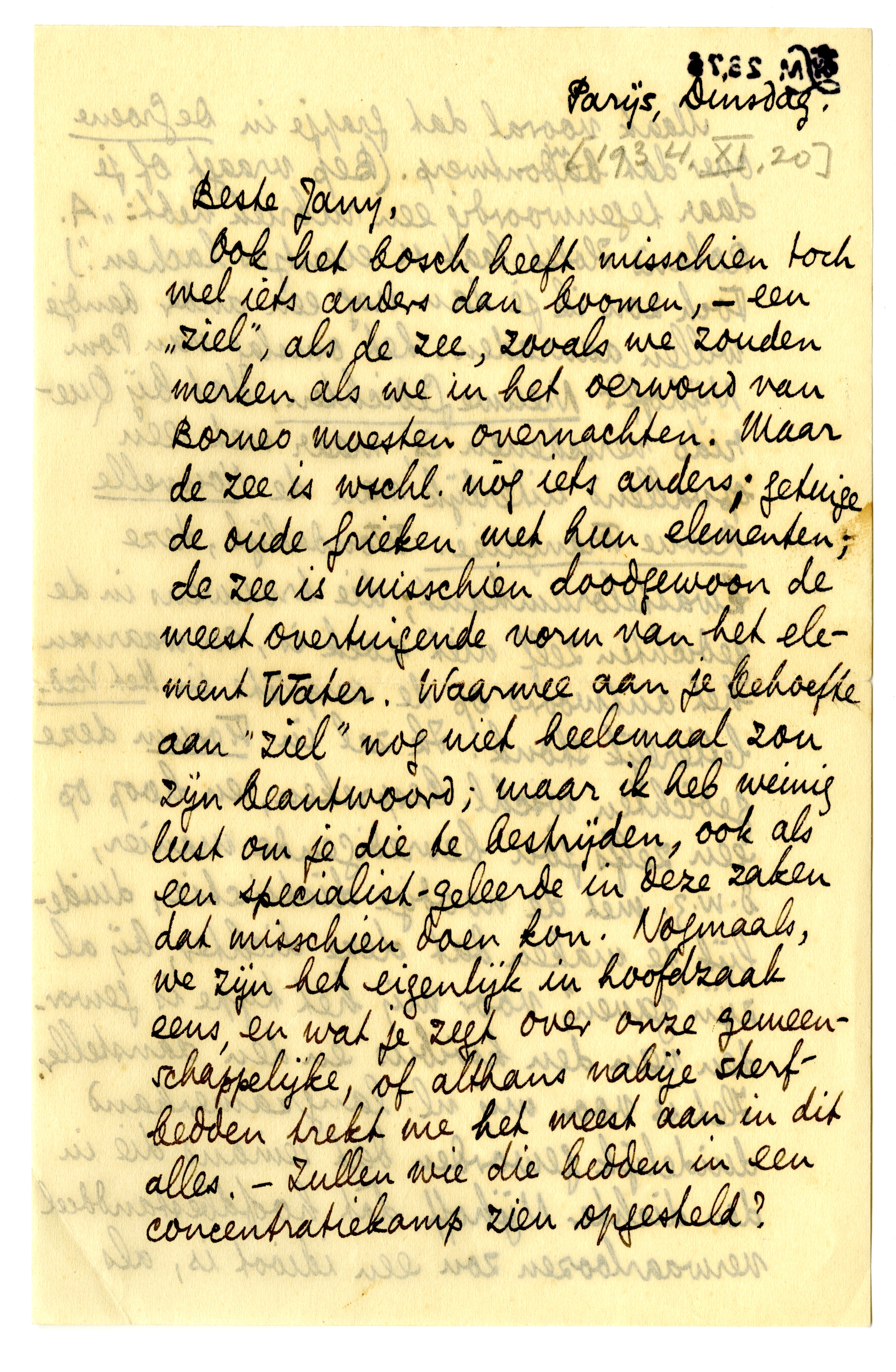 Ook het bosch heeft misschien toch wel iets anders dan boomen, - een ‘ziel’, als de zee, zooals we zouden merken als we in het oerwoud van Borneo moesten overnachten. Maar de zee is wschl. nòg iets anders; getuige de oude Grieken met hun elementen; de zee is misschien doodgewoon de meest overtuigende vorm van het element Water. Waarmee aan je behoefte aan ‘ziel’ nog niet heelemaal zou zijn beantwoord; maar ik heb weinig lust om je die te bestrijden, ook als een specialist-geleerde in deze zaken dat misschien doen kon. Nogmaals, we zijn het eigenlijk in hoofdzaak eens, en wat je zegt over onze gemeenschappelijke, of althans nabije sterfbedden trekt me het meest aan in dit alles. - Zullen wie die bedden in een concentratiekamp zien opgesteld?