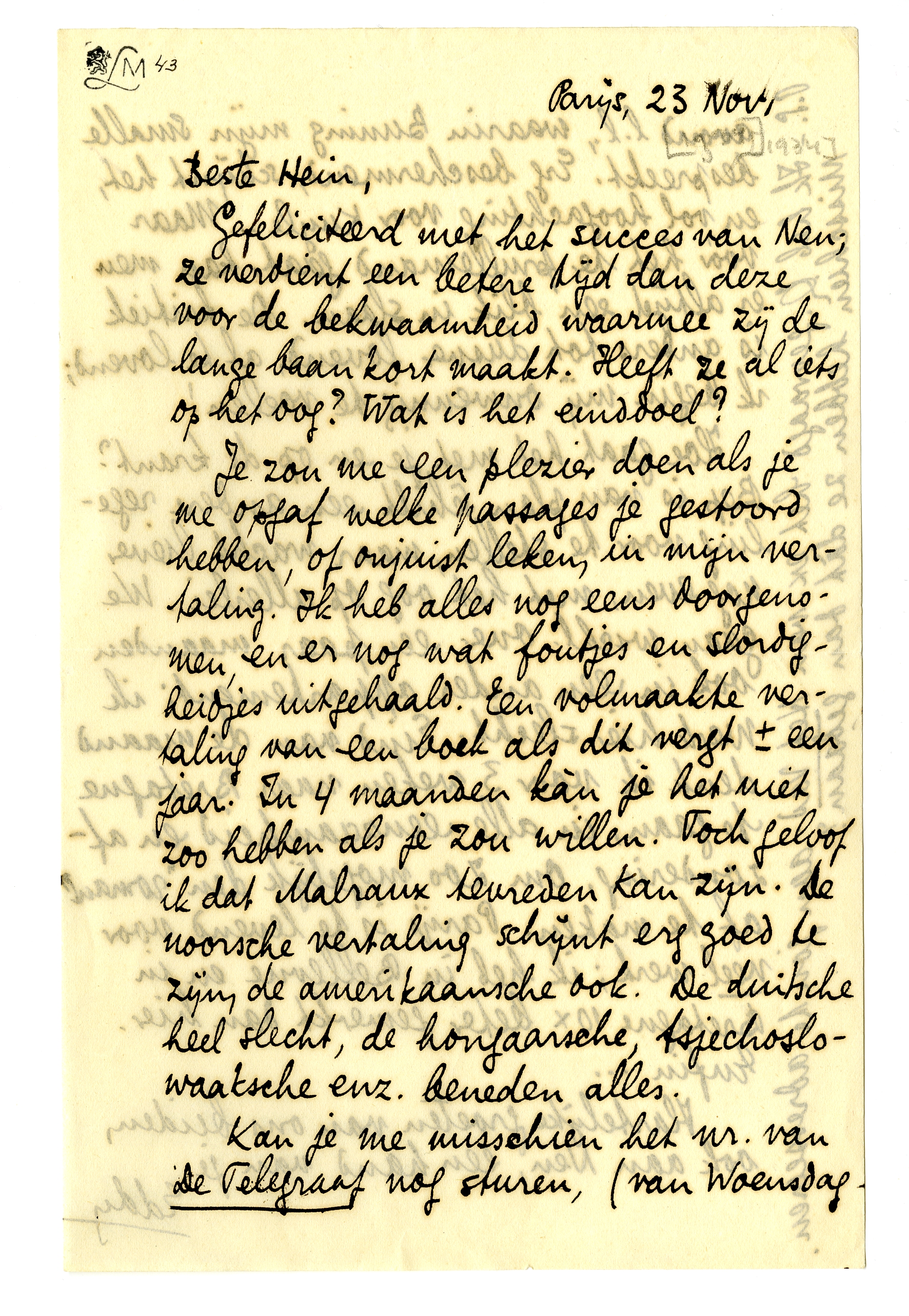 Je zou me een plezier doen als je me opgaf welke passages je gestoord hebben, of onjuist leken, in mijn vertaling. Ik heb alles nog eens doorgenomen, en er nog wat foutjes en slordigheidjes uitgehaald. Een volmaakte vertaling van een boek als dit vergt ± een jaar. In 4 maanden kàn je het niet zoo hebben als je zou willen. Toch geloof ik dat Malraux tevreden kan zijn. De noorsche vertaling schijnt erg goed te zijn, de amerikaansche ook. De duitsche heel slecht, de hongaarsche, tsjechoslowaaksche enz. beneden alles.