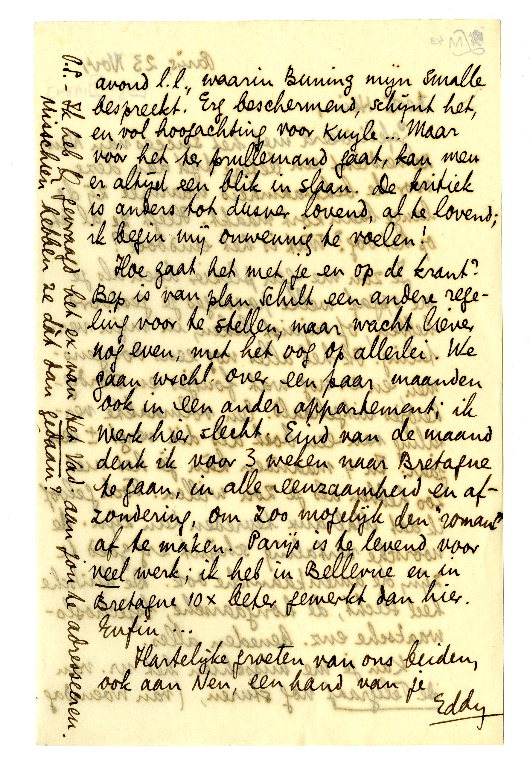 Hoe gaat het met je en op de krant? Bep is van plan Schilt een andere regeling voor te stellen, maar wacht liever nog even, met het oog op allerlei. We gaan wschl. over een paar maanden ook in een ander appartement; ik werk hier slecht. Eind van de maand denk ik voor 3 weken naar Bretagne te gaan, in alle eenzaamheid en afzondering, om zoo mogelijk den ‘roman’ af te maken. Parijs is te levend voor veel werk; ik heb in Bellevue en in Bretagne 10 × beter gewerkt dan hier. Enfin...