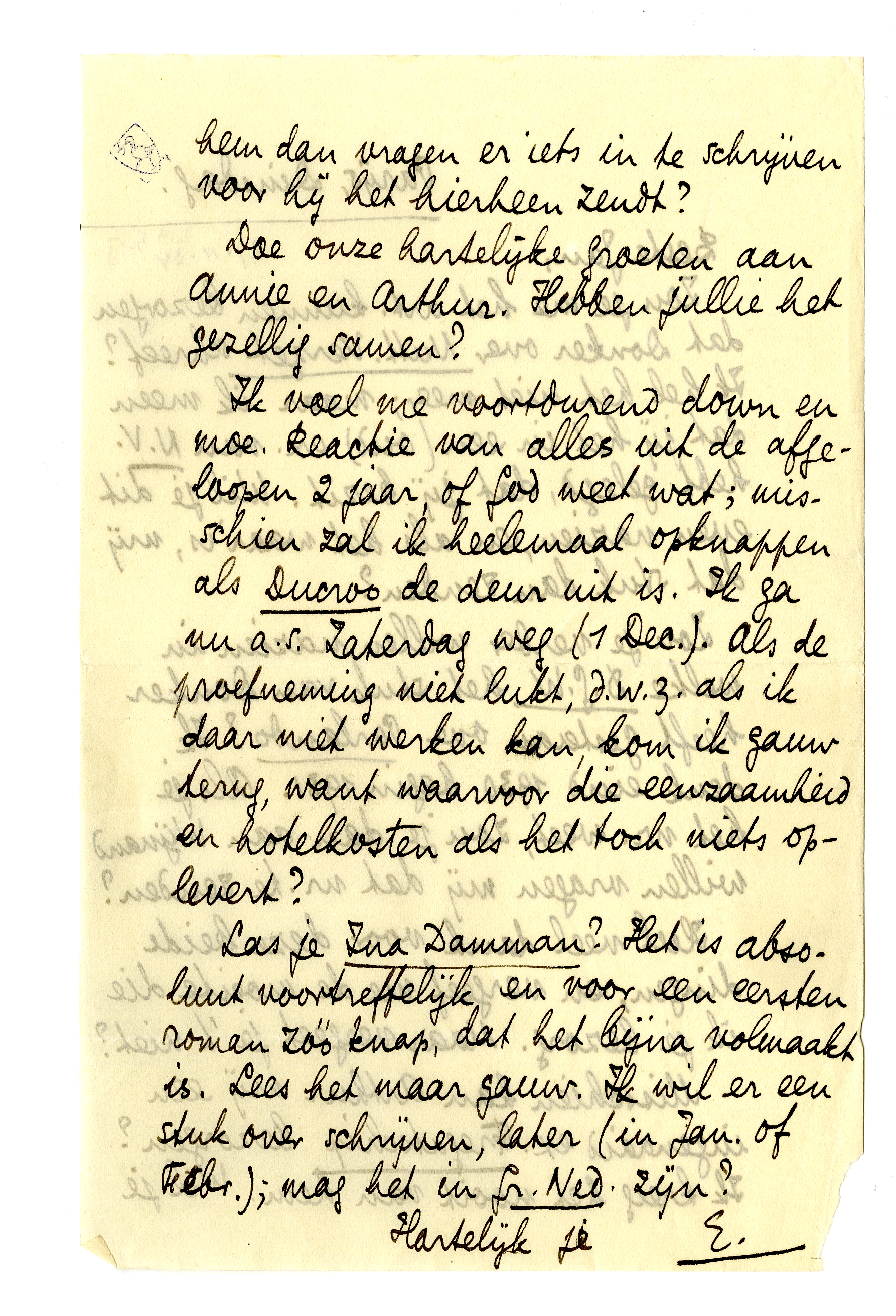 Ik voel me voortdurend down en moe. Reactie van alles uit de afgeloopen 2 jaar, of God weet wat; misschien zal ik heelemaal opknappen als Ducroo de deur uit is. Ik ga nu a.s. Zaterdag weg (1 Dec.). Als de proefneming niet lukt, d.w.z. als ik daar niet werken kan, kom ik gauw terug, want waarvoor die eenzaamheid en hotelkosten als het toch niets oplevert?