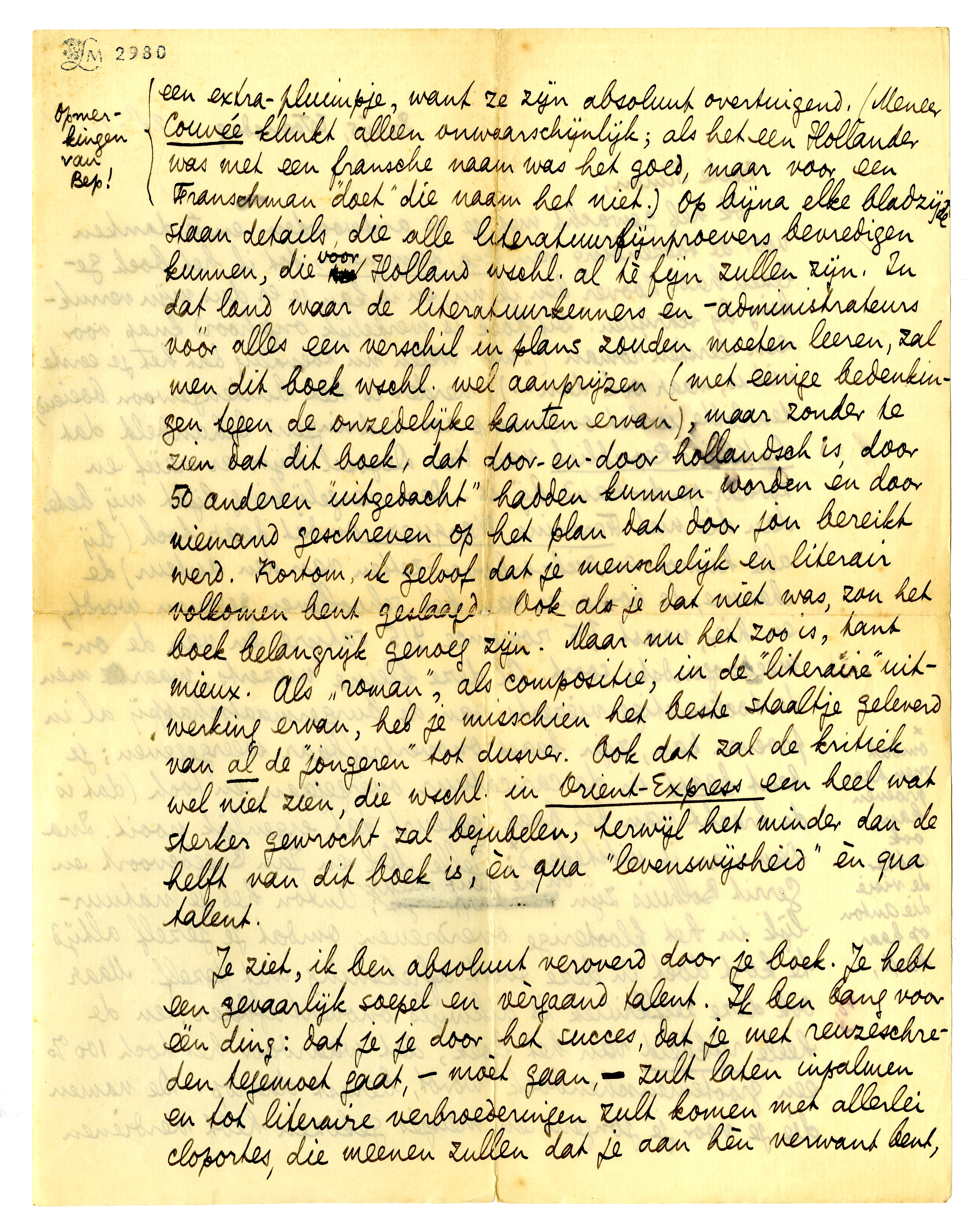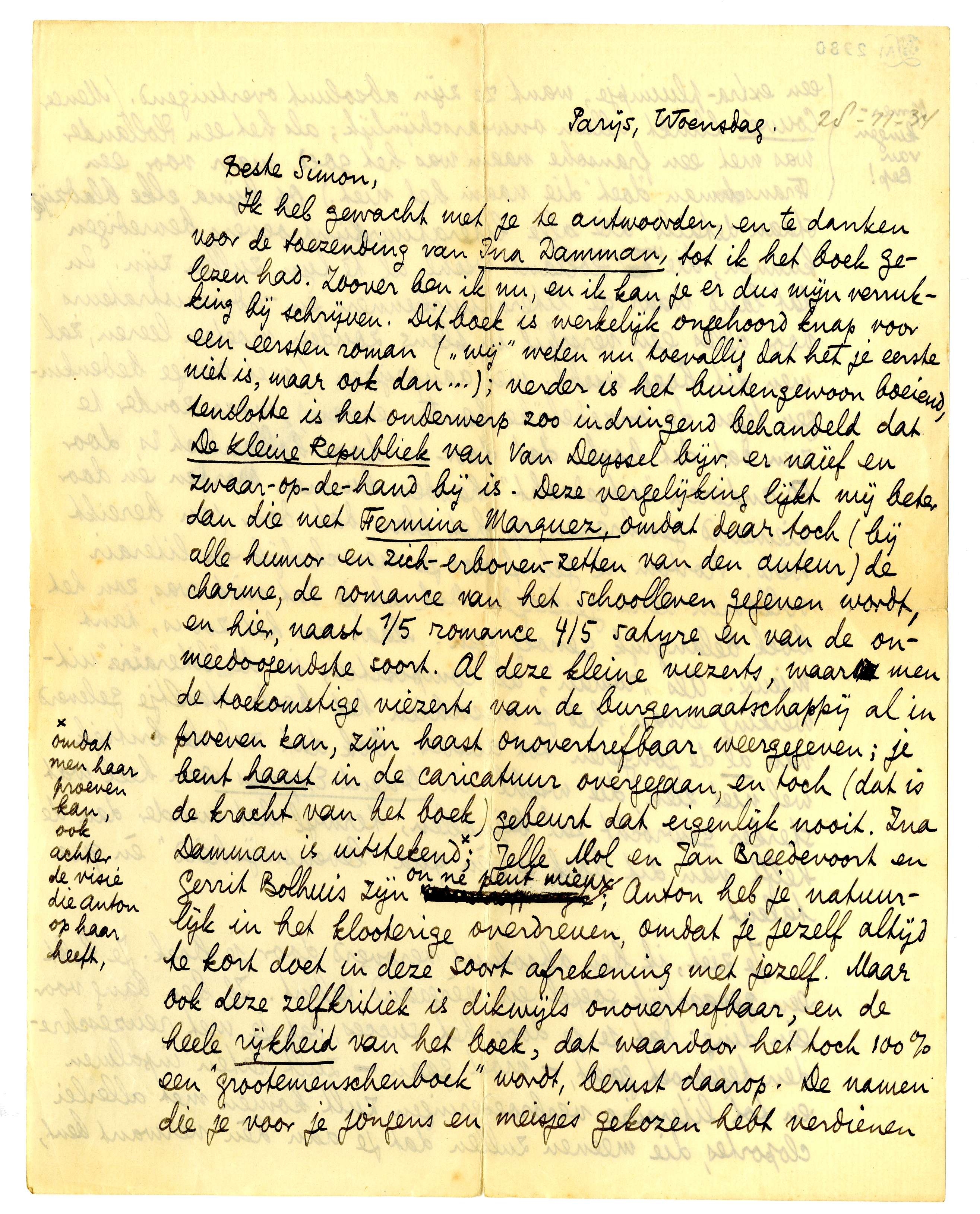Ik heb gewacht met je te antwoorden, en te danken voor de toezending van Ina Damman, tot ik het boek gelezen had. Zoover ben ik nu, en ik kan je er dus mijn verrukking bij schrijven. Dit boek is werkelijk ongehoord knap voor een eersten roman (‘wij’ weten nu toevallig dat het je eerste niet is, maar ook dan...); verder is het buitengewoon boeiend, tenslotte is het onderwerp zoo indringend behandeld dat De Kleine Republiek van Van Deyssel bijv. er naïef en zwaar-op-de-hand bij is. Deze vergelijking lijkt mij beter dan die met Fermina Marquez, omdat daar toch (bij alle humor en zich-erboven-zetten van den auteur) de charme, de romance van het schoolleven gegeven wordt, en hier, naast 1/5 romance 4/5 satyre en van de onmeedoogendste soort. Al deze kleine viezerts, waar men de toekomstige viezerts van de burgermaatschappij al in proeven kan, zijn haast onovertrefbaar weergegeven; je bent haast in de caricatuur overgegaan, en toch (dat is de kracht van het boek) gebeurt dat eigenlijk nooit. Ina Damman is uitstekend*; Jelle Mol en Jan Breedevoort en Gerrit Bolhuis zijn on ne peut mieux; Anton heb je natuurlijk in het klooterige overdreven, omdat je jezelf altijd te kort doet in deze soort afrekening met jezelf. Maar ook deze zelfkritiek is dikwijls onovertrefbaar, en de heele rijkheid van het boek, dat waardoor het toch 100% een ‘grootemenschenboek’ wordt, berust daarop. De namen die je voor je jongens en meisjes gekozen hebt verdienen een extra-pluimpje, want ze zijn absoluut overtuigend. (Meneer Couvée klinkt alleen onwaarschijnlijk; als het een Hollander was met een fransche naam was het goed, maar voor een Franschman ‘doet’ die naam het niet.)3462 Op bijna elke bladzijde staan details, die alle literatuurfijnproevers bevredigen kunnen, die voor Holland wschl. al tè fijn zullen zijn. In dat land waar de literatuurkenners en -administrateurs vóór alles een verschil in plans zouden moeten leeren, zal men dit boek wschl. wel aanprijzen (met eenige bedenkingen tegen de onzedelijke kanten ervan), maar zonder te zien dat dit boek, dat door-en-door hollandsch is, door 50 anderen ‘uitgedacht’ hadden kunnen worden en door niemand geschreven op het plan dat door jou bereikt werd. Kortom, ik geloof dat je menschelijk en literair volkomen bent geslaagd. Ook als je dat niet was, zou het boek belangrijk genoeg zijn. Maar nu het zoo is, tant mieux. Als ‘roman’, als compositie, in de ‘literaire’ uitwerking ervan, heb je misschien het beste staaltje geleverd van al de ‘jongeren’ tot dusver. Ook dat zal de kritiek wel niet zien, die wschl. in Orient-Express een heel wat sterker gewrocht zal bejubelen, terwijl het minder dan de helft van dit boek is, èn qua ‘levenswijsheid’ èn qua talent.