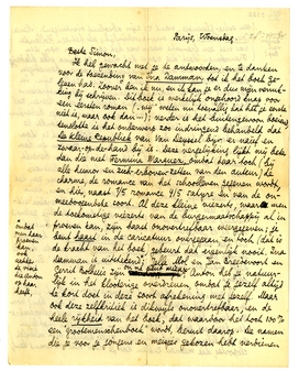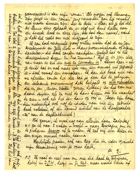 P.S. Ik voel er veel voor om over dit boek te schrijven, hetzij in D.G.W., hetzij in Gr. Ned., maar wacht liever af tot de holl. kritiek zich heeft uitgesproken. Op het moment zou de tijd me ook ontbreken. - Tot slot 2 minuscule foutjes: op blz. 144 zegt Couvée: ‘à la bonheur!’ (holl. verschrijving voor ‘à la bonne heure’, maar voor een Franschman vervelend. Het lied van Andreas Hofer begint met: ‘Zu Mantua’, niet met ‘In M.’... - De dialoog is in je boek ook voortreffelijk; tegelijk waschecht en reëel, en toch satyriek door den schrijver belicht, door de synthese die je telkens gemaakt hebt.