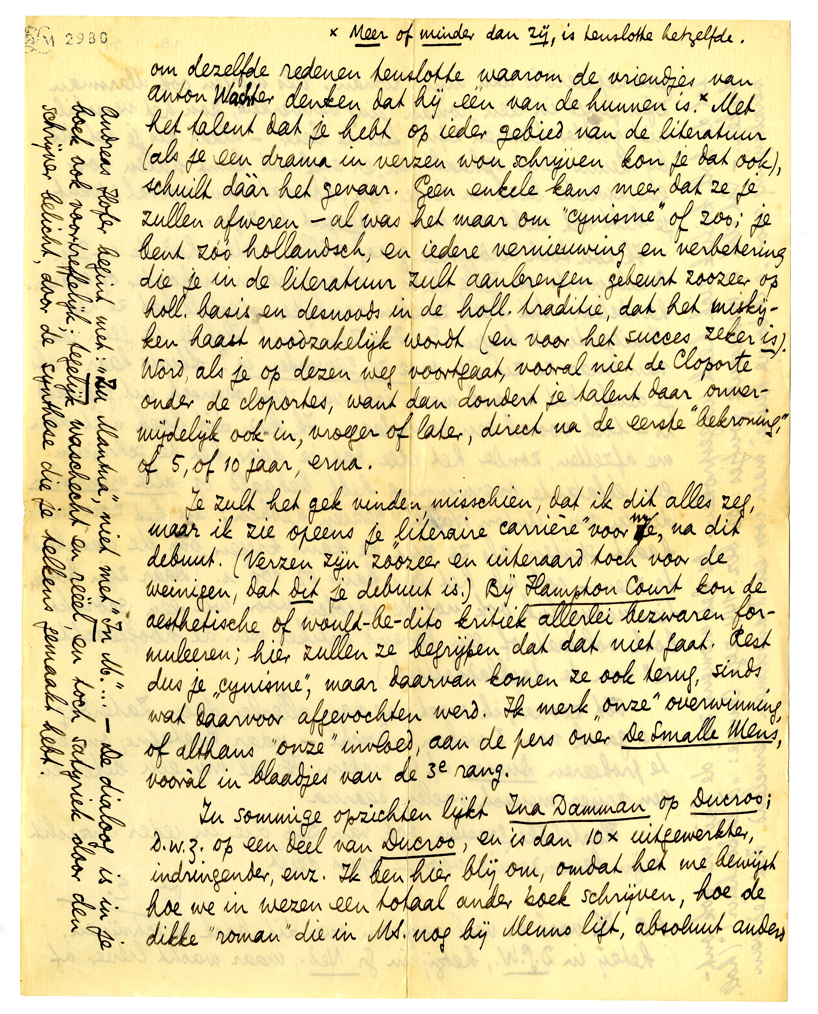 Je zult het gek vinden, misschien, dat ik dit alles zeg, maar ik zie opeens je ‘literaire carrière’ voor me, na dit debuut. (Verzen zijn zoozeer en uiteraard toch voor de weinigen, dat dit je debuut is.) Bij Hampton Court kon de aesthetische of would-be-dito kritiek allerlei bezwaren formuleeren; hier zullen ze begrijpen dat dat niet gaat. Rest dus je ‘cynisme’, maar daarvan komen ze ook terug, sinds wat daarvoor afgevochten werd. Ik merk ‘onze’ overwinning, of althans ‘onze’ invloed, aan de pers over De Smalle Mens, vooràl in blaadjes van de 3e rang.