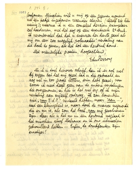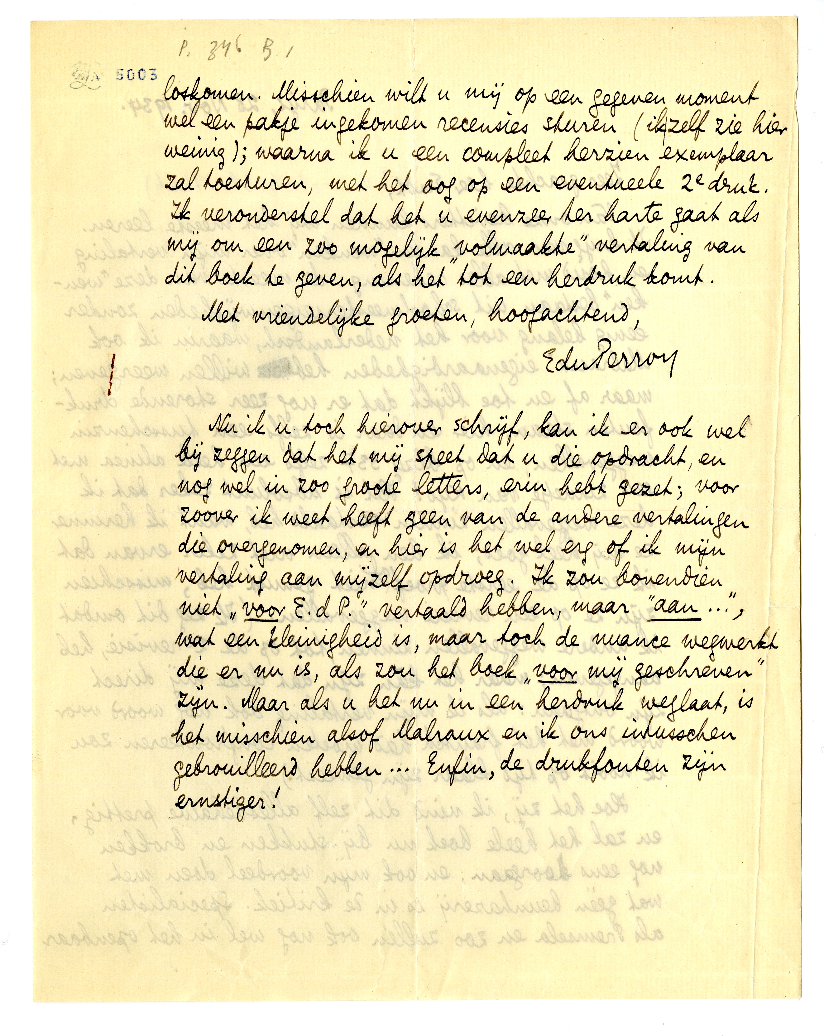 Nu ik u toch hierover schrijf, kan ik er ook wel bij zeggen dat het mij speet dat u die opdracht, en nog wel in zoo groote letters, erin hebt gezet; voor zoover ik weet heeft geen van de andere vertalingen die overgenomen, en hier is het wel erg of ik mijn vertaling aan mijzelf opdroeg. Ik zou bovendien niet ‘voor E. d P.’ vertaald hebben, maar ‘aan...’, wat een kleinigheid is, maar toch de nuance wegwerkt die er nu is, als zou het boek ‘voor mij geschreven’ zijn. Maar als u het nu in een herdruk weglaat, is het misschien alsof Malraux en ik ons intusschen gebrouilleerd hebben... Enfin, de drukfouten zijn ernstiger!