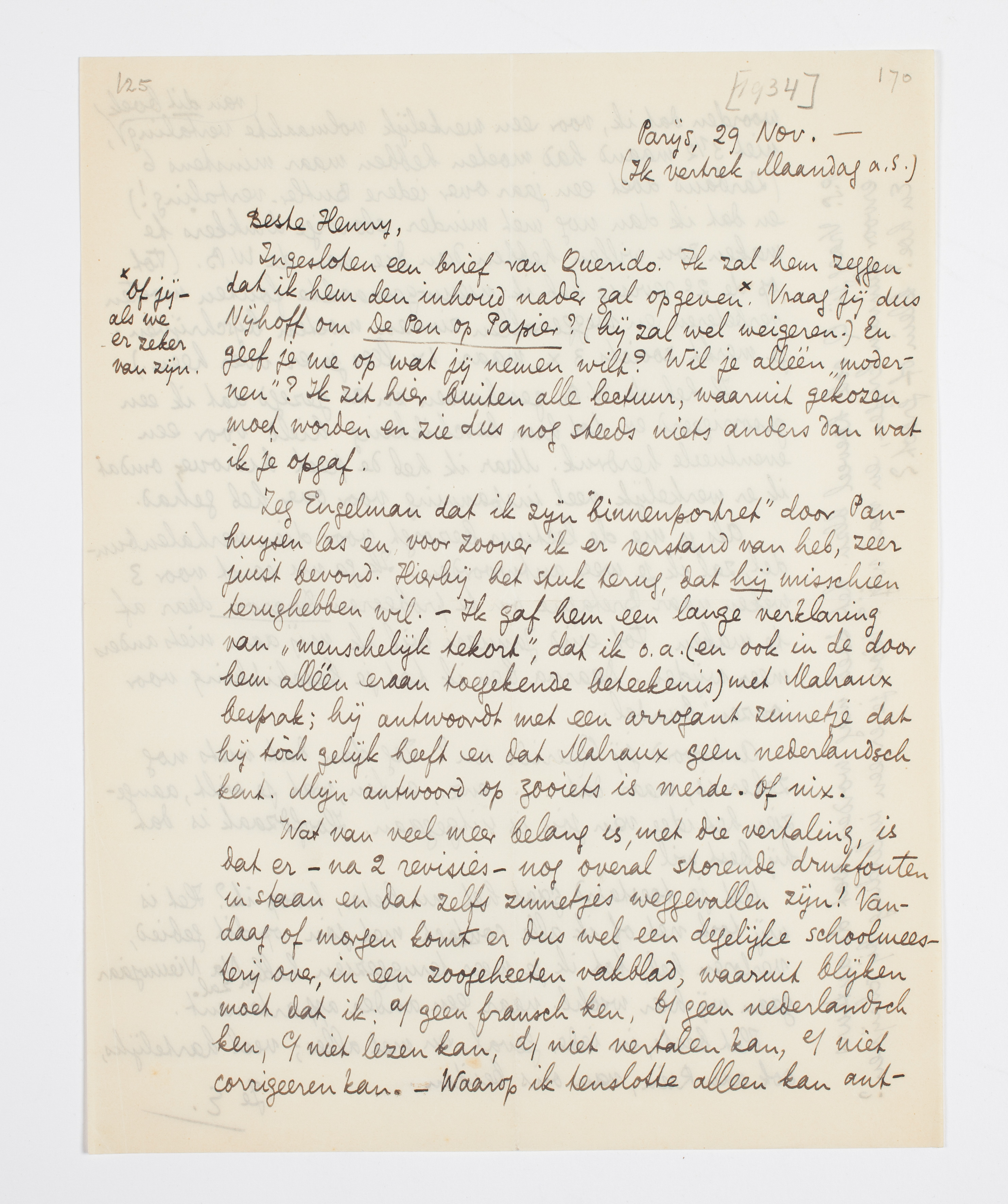 Ingesloten een brief van Querido. Ik zal hem zeggen dat ik hem den inhoud nader zal opgeven.* Vraag jij dus Nijhoff om De Pen op Papier? (hij zal wel weigeren.) En geef je me op wat jij nemen wilt? Wil je alléén ‘modernen’? Ik zit hier buiten alle lectuur, waaruit gekozen moet worden en zie dus nog steeds niets anders dan wat ik je opgaf.