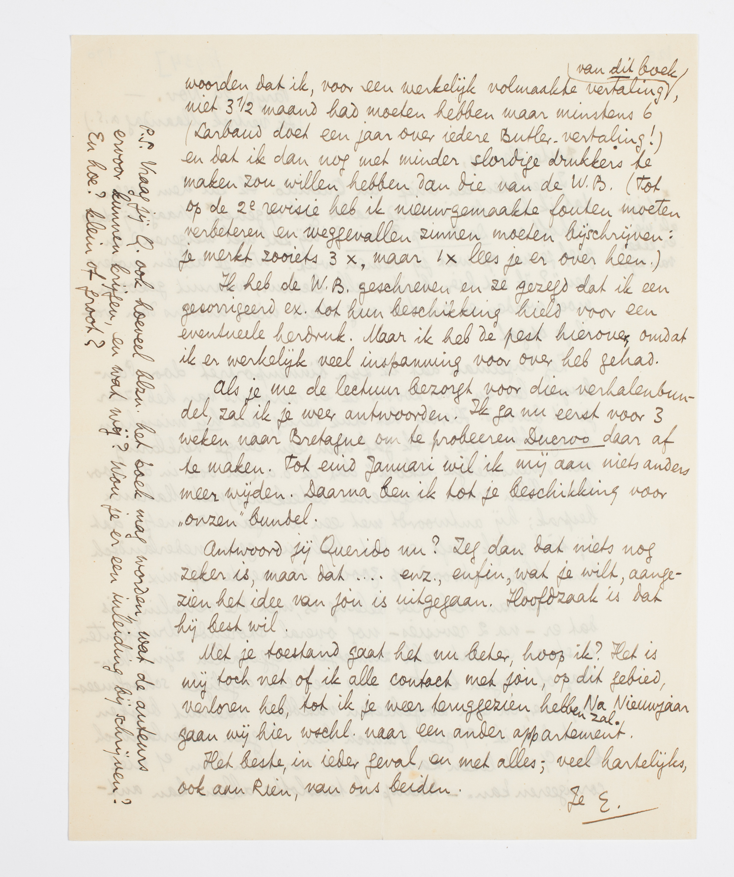 Als je me de lectuur bezorgt voor dien verhalenbundel, zal ik je weer antwoorden. Ik ga nu eerst voor 3 weken naar Bretagne om te probeeren Ducroo daar af te maken. Tot eind Januari wil ik mij aan niets anders meer wijden. Daarna ben ik tot je beschikking voor ‘onzen’ bundel.