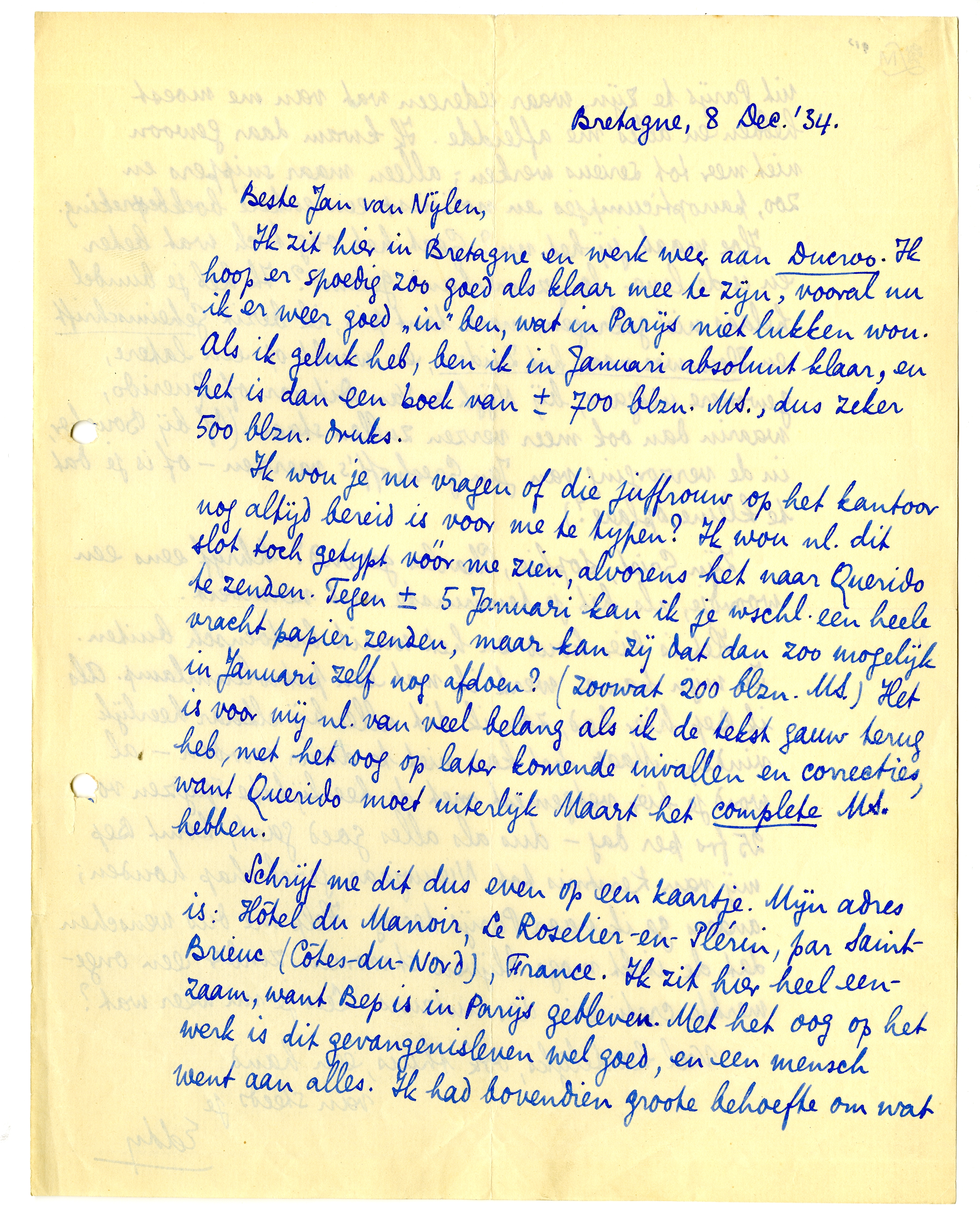 Ik zit hier in Bretagne en werk weer aan Ducroo. Ik hoop er spoedig zoo goed als klaar mee te zijn, vooral nu ik er weer goed ‘in’ ben, wat in Parijs niet lukken wou. Als ik geluk heb, ben ik in Januari absoluut klaar, en het is dan een boek van ± 700 blzn. MS., dus zeker 500 blzn. druks.