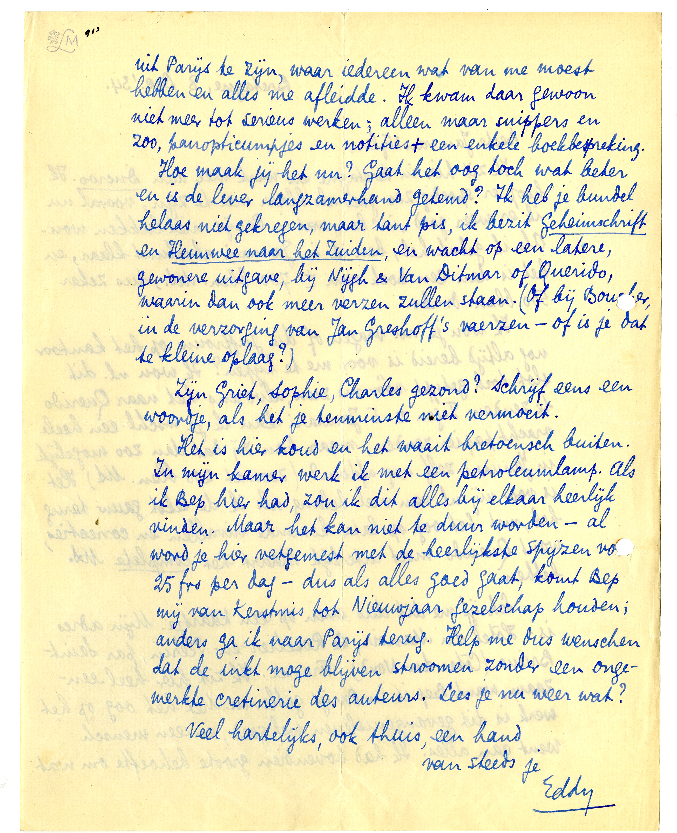 Hoe maak jij het nu? Gaat het oog toch wat beter en is de lever langzamerhand getemd? Ik heb je bundel helaas niet gekregen, maar tant pis, ik bezit Geheimschrift en Heimwee naar het Zuiden, en wacht op een latere, gewonere uitgave, bij Nijgh & Van Ditmar of Querido, waarin dan ook meer verzen zullen staan. (Of bij Boucher, in de verzorging van Jan Greshoff's vaerzen - of is je dat te kleine oplaag?)