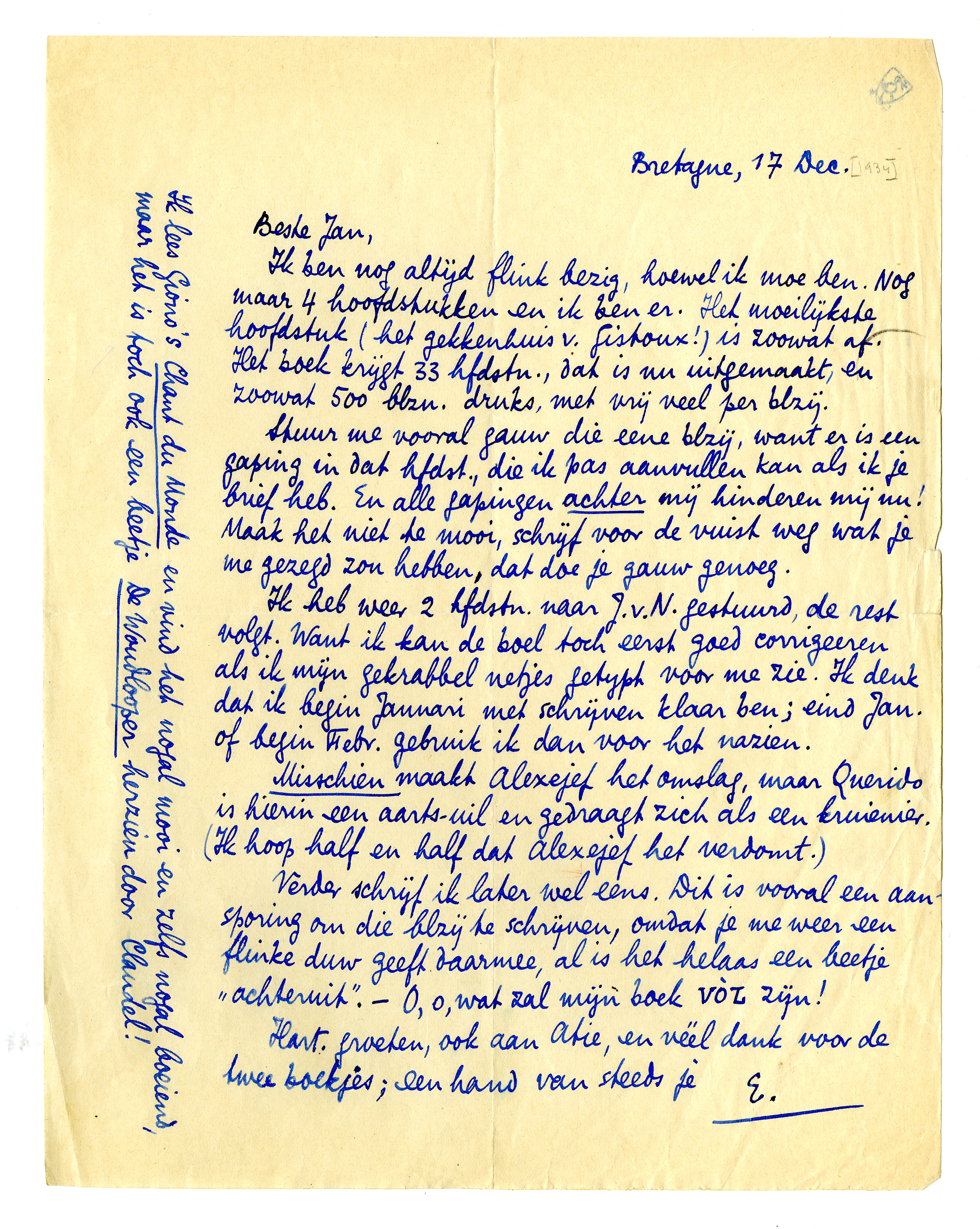 Ik ben nog altijd flink bezig, hoewel ik moe ben. Nog maar 4 hoofdstukken en ik ben er. Het moeilijkste hoofdstuk (het gekkenhuis v. Gistoux!) is zoowat af. Het boek krijgt 33 hfdstn., dat is nu uitgemaakt, en zoowat 500 blzn. druks, met vrij veel per blzij.