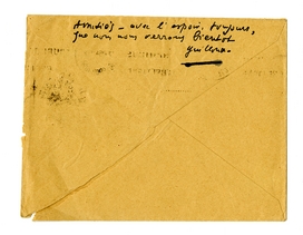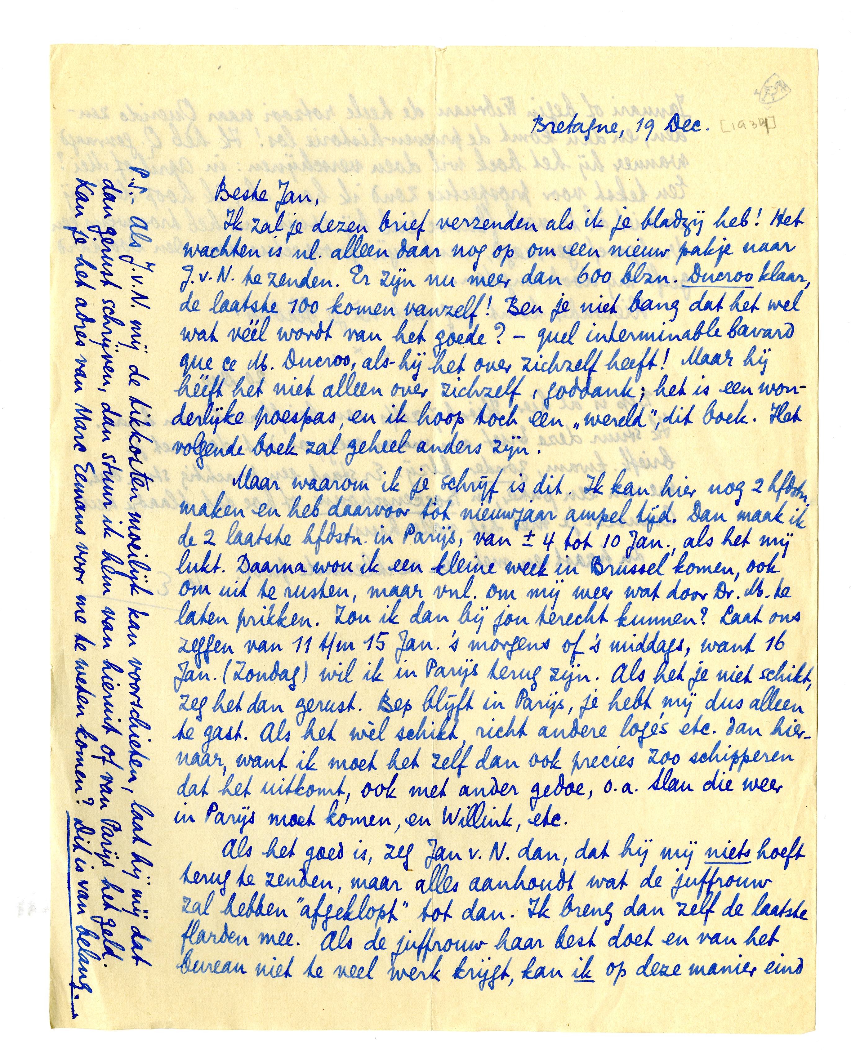 P.S. - Als J.v.N. mij de tikkosten moeilijk kan voorschieten, laat hij mij dat dan gerust schrijven, dan stuur ik hem van hieruit of van Parijs het geld. Kan je het adres van Marc Eemans voor me te weten komen? Dit is van belang.