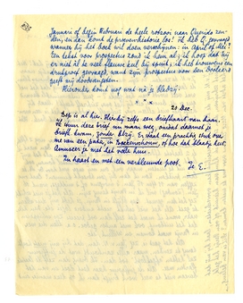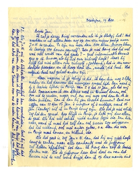Maar waarom ik je schrijf is dit. Ik kan hier nog 2 hfdstn. maken en heb daarvoor tot nieuwjaar ampel tijd. Dan maak ik de 2 laatste hfdstn. in Parijs, van ± 4 tot 10 Jan., als het mij lukt. Daarna wou ik een kleine week in Brussel komen, ook om uit te rusten, maar vnl. om mij weer wat door Dr. M. te laten prikken. Zou ik dan bij jou terecht kunnen? Laat ons zeggen van 11 t/m 15 Jan. 's morgens of 's middags, want 16 Jan. (Zondag) wil ik in Parijs terug zijn. Als het je niet schikt, zeg het dan gerust. Bep blijft in Parijs, je hebt mij dus alleen te gast. Als het wèl schikt, richt andere logés etc. dan hiernaar, want ik moet het zelf dan ook precies zoo schipperen dat het uitkomt, ook met ander gedoe, o.a. Slau die weer in Parijs moet komen, en Willink, etc.