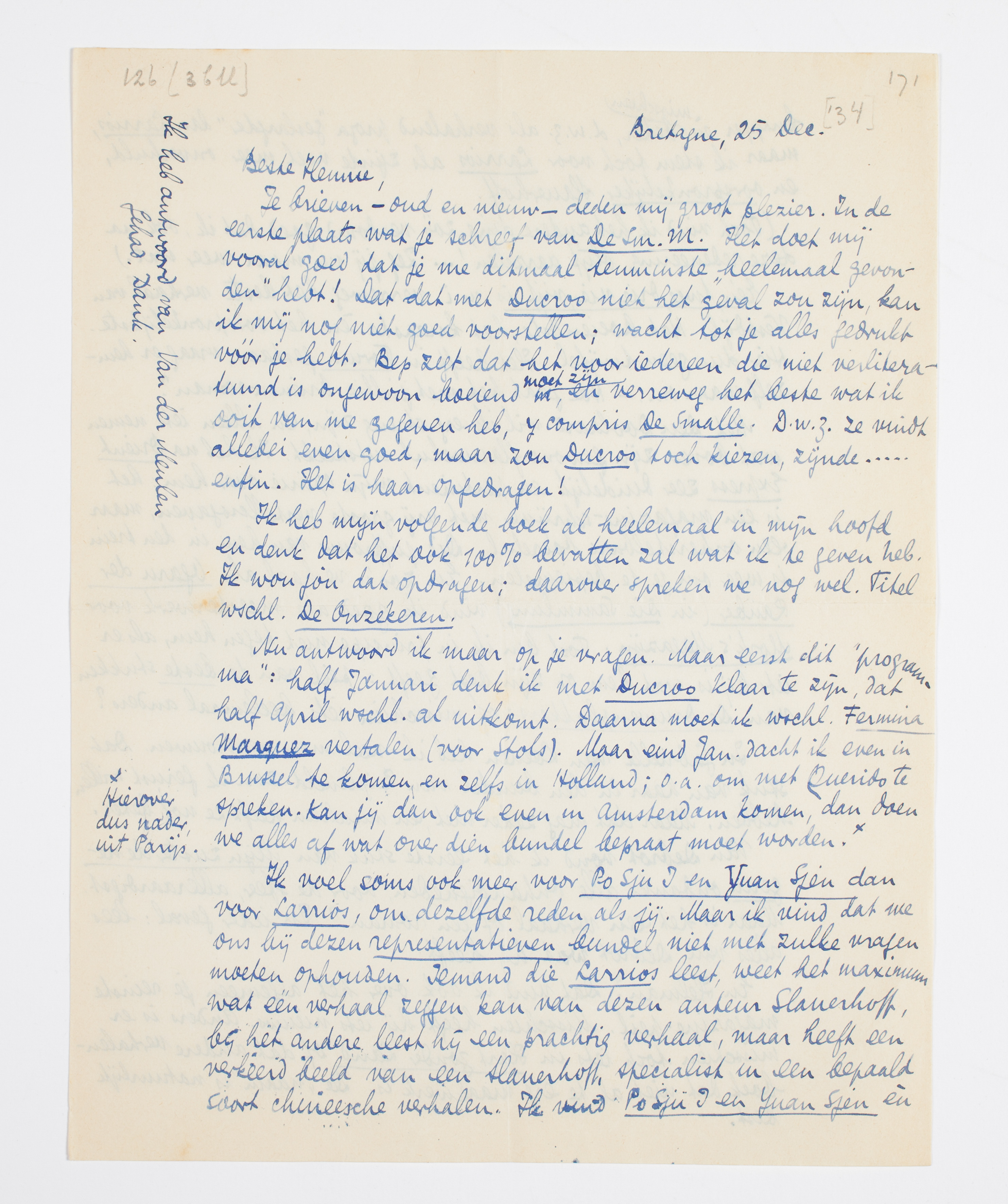 Nu antwoord ik maar op je vragen. Maar eerst dit ‘programma’; half Januari denk ik met Ducroo klaar te zijn, dat half April wschl. al uitkomt. Daarna moet ik wschl. Fermina Marquez vertalen (voor Stols). Maar eind Jan. dacht ik even in Brussel te komen en zelfs in Holland; o.a. om met Querido te spreken. Kan jij dan ook even in Amsterdam komen, dan doen we alles af wat over dien bundel bepraat moet worden.*3494