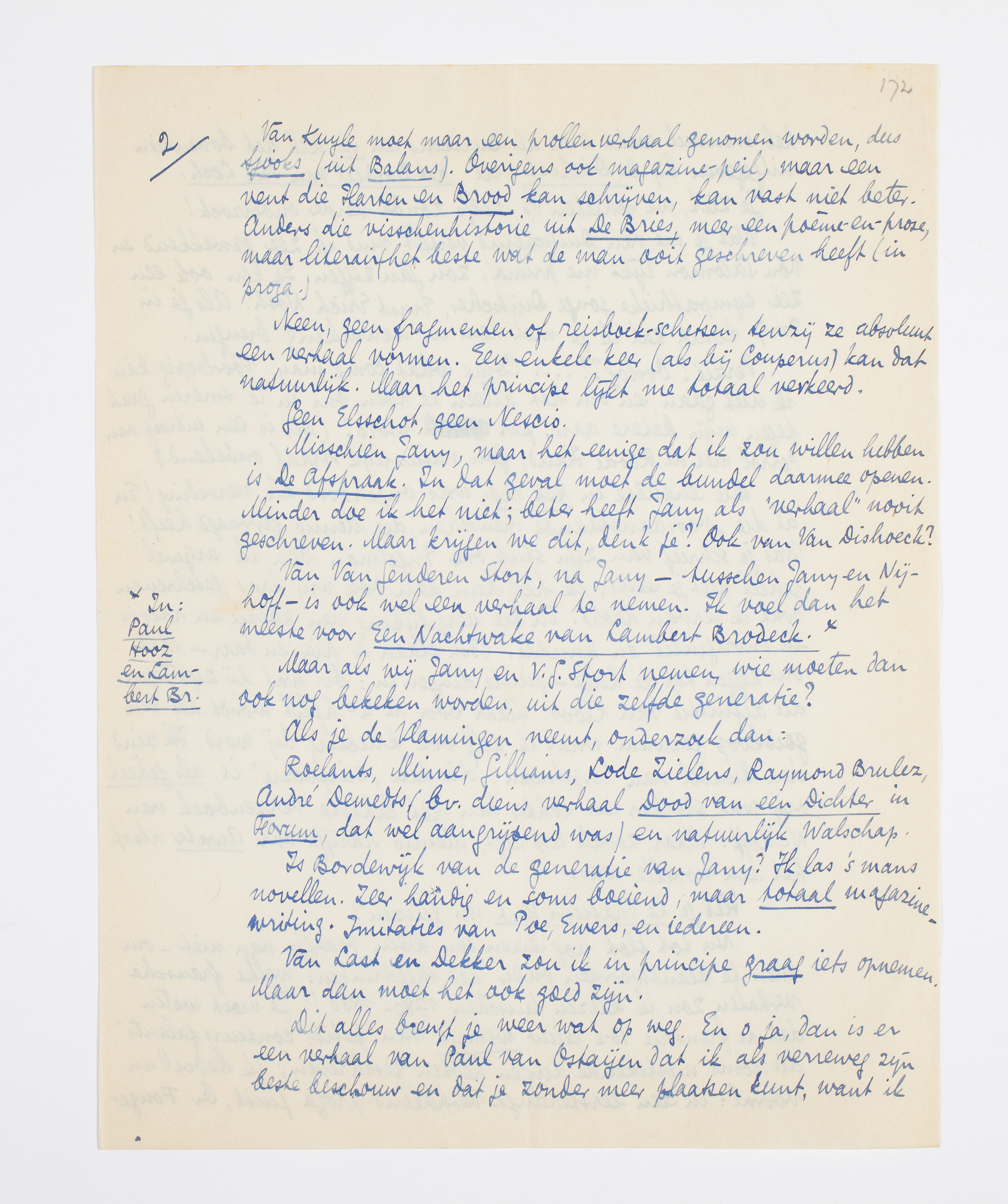 Dit alles brengt je weer wat op weg. En o ja, dan is er een verhaal van Paul van Ostaijen dat ik als verreweg zijn beste beschouw en dat je zonder meer plaatsen kunt, want ik heb evenveel recht erop als Burssens en ik heb het bovendien uitgegeven bij De Driehoek, nl. Het Bordeel van Ika Loch.
