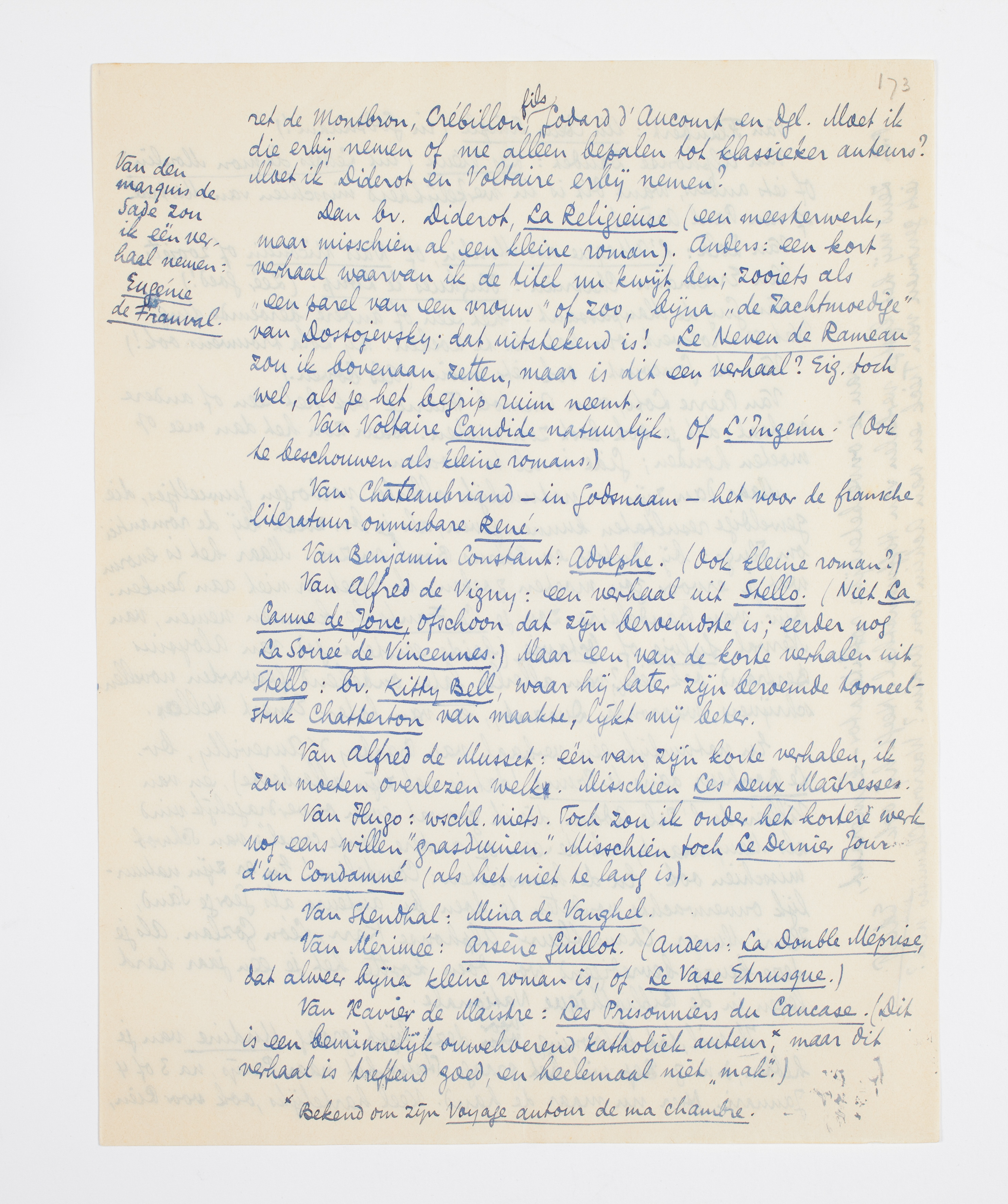 Nu tot slot nog even een klein vraagje van niets - om even te beantwoorden onder het theedrinken: welke fransche verhalen zou ik kiezen tusschen 1780-1880!! Je moet weten dat de fransche 18-e eeuw wemelt van ‘petits conteurs galants’ die soms uitstekende dingen hebben geschreven; ik bedoel nu vooral: in een eersterangs-verhalend-proza juist, bv. Fougeret de Montbron, Crébillon fils, Godard d'Aucourt en dgl. Moet ik die erbij nemen of me alleen bepalen tot klassieker auteurs? Moet ik Diderot en Voltaire erbij nemen?*