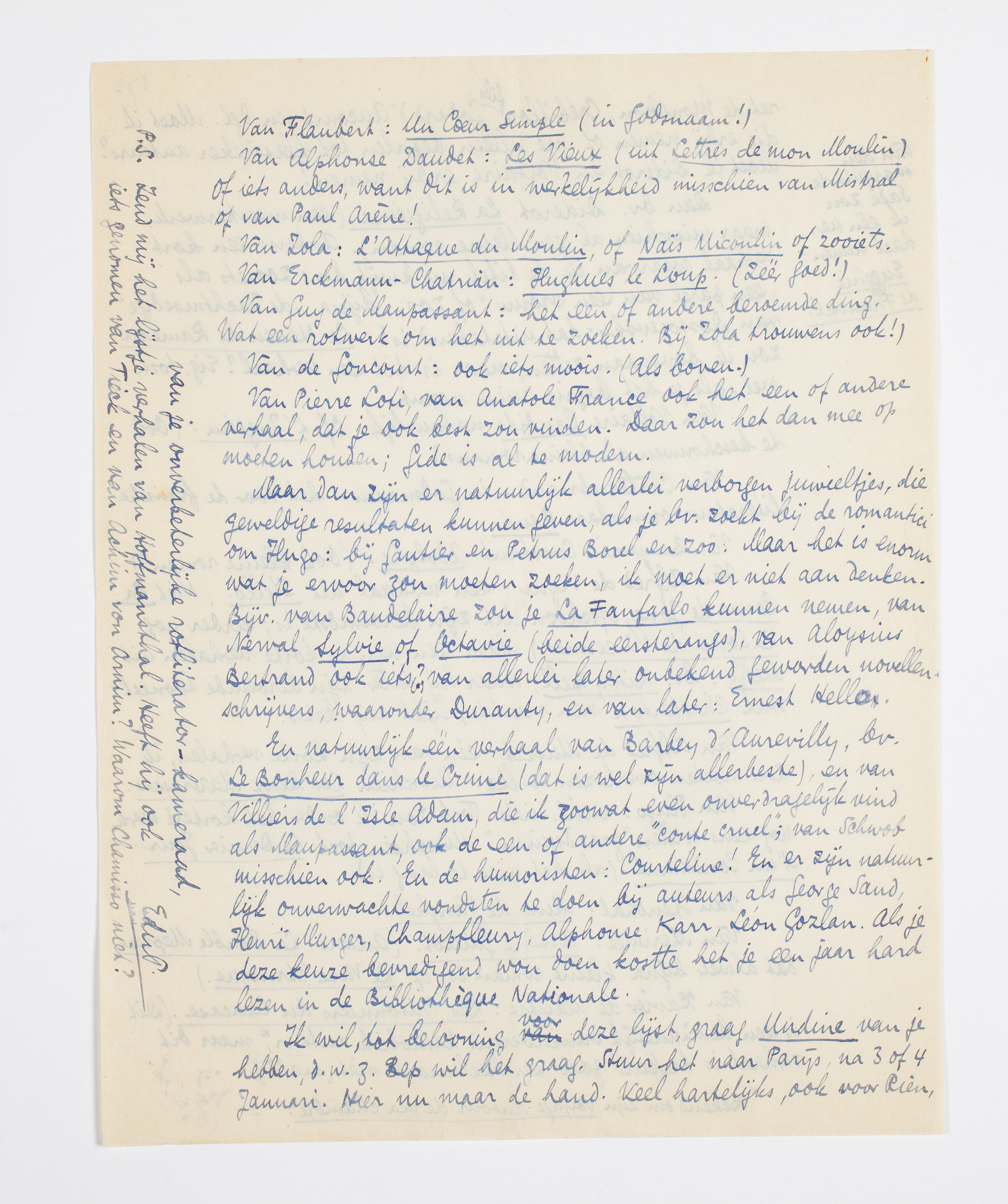 Ik wil, tot belooning voor deze lijst, graag Undine van je hebben, d.w.z. Bep wil het graag. Stuur het naar Parijs, na 3 of 4 Januari. Hier nu maar de hand. Veel hartelijks, ook voor Rien, van je onverbeterlijke rotliterator-kameraad,