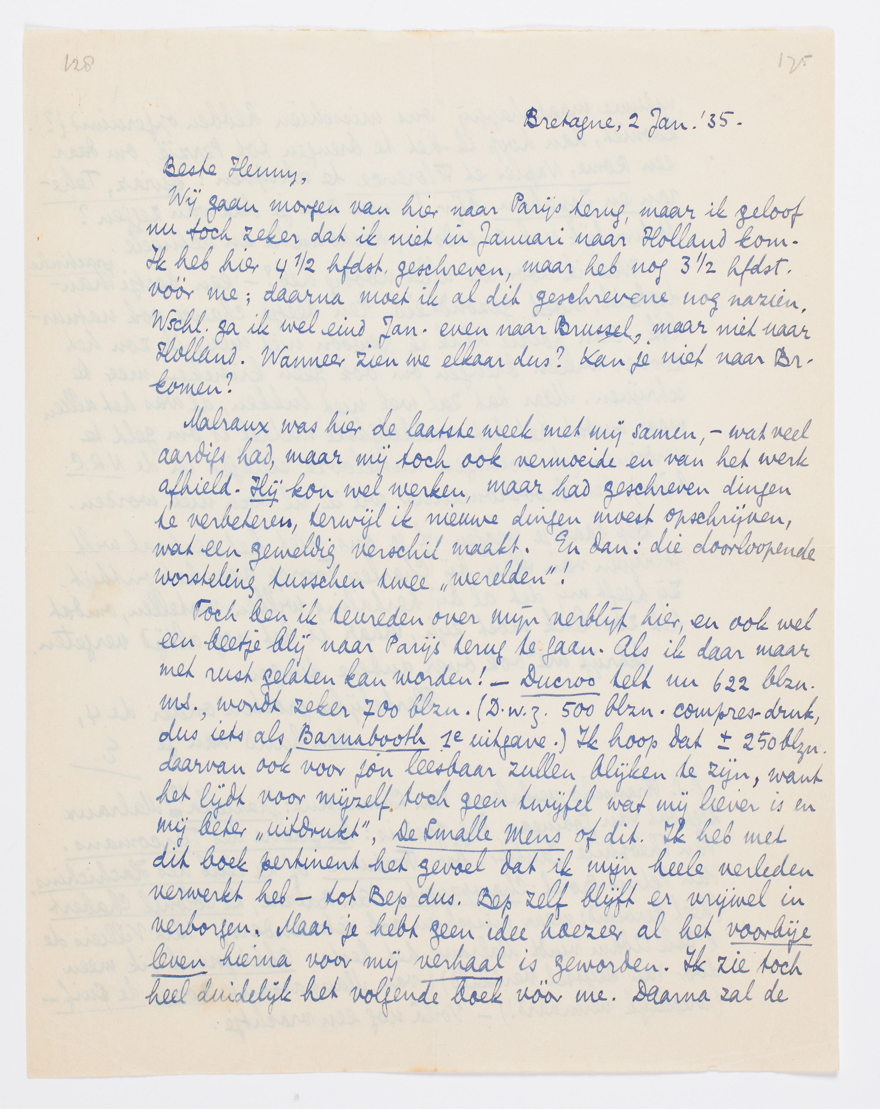 Wij gaan morgen van hier naar Parijs terug, maar ik geloof nu toch zeker dat ik niet in Januari naar Holland kom. Ik heb hier 4½ hfdst. geschreven, maar heb nog 3½ hfdst. vóór me; daarna moet ik al dit geschrevene nog nazien. Wschl. ga ik wel eind Jan. even naar Brussel, maar niet naar Holland. Wanneer zien we elkaar dus? Kan je niet naar Br. komen?