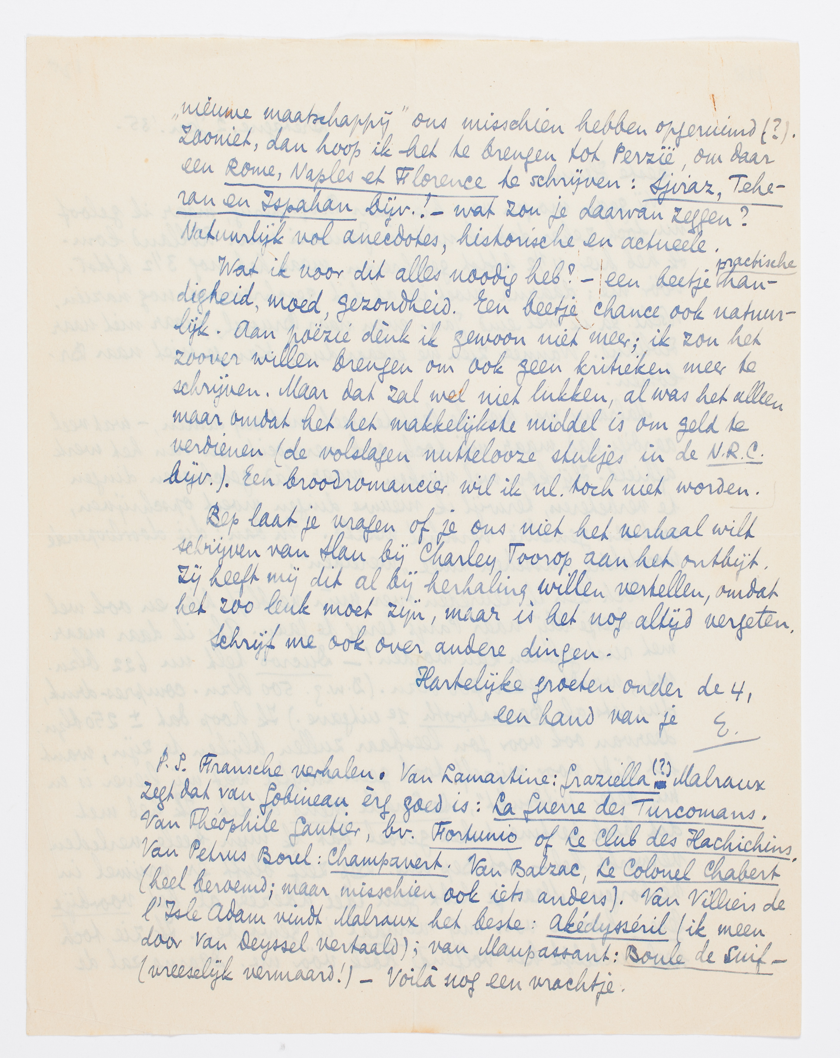Toch ben ik tevreden over mijn verblijf hier, en ook wel een beetje blij naar Parijs terug te gaan. Als ik daar maar met rust gelaten kan worden! - Ducroo telt nu 622 blzn. ms., wordt zeker 700 blzn. (D.w.z. 500 blzn. compresdruk, dus iets als Barnabooth 1e uitgave.) Ik hoop dat ± 250 blzn. daarvan ook voor jou leesbaar zullen blijken te zijn, want het lijdt voor mijzelf toch geen twijfel wat mij liever is en mij beter ‘uitdrukt’, De Smalle Mens of dit. Ik heb met dit boek pertinent het gevoel dat ik mijn heele verleden verwerkt heb - tot Bep dus. Bep zelf blijft er vrijwel in verborgen. Maar je hebt geen idee hoezeer al het voorbije leven hierna voor mij verhaal is geworden. Ik zie toch heel duidelijk het volgende boek vóór me. Daarna zal de ‘nieuwe maatschappij’ ons misschien hebben opgeruimd (?). Zooniet, dan hoop ik het te brengen tot Perzië, om daar een Rome, Naples et Florence te schrijven: Sjiraz, Teheran en Ispahan bijv.! - wat zou je daarvan zeggen? Natuurlijk vol anecdotes, historische en actueele.