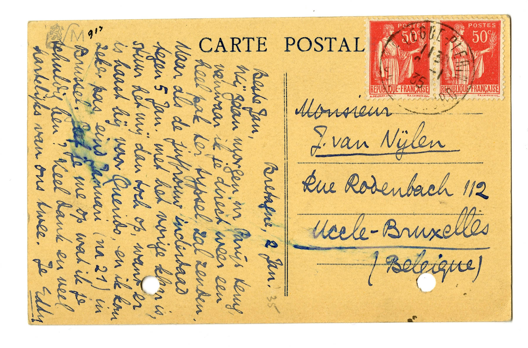 Wij gaan morgen nr Parijs terug, vanwaar ik je direct weer een heel pak3519 ter typsel zal zenden. Maar als de juffrouw inderdaad tegen 5 Jan. met het vorige klaar is, stuur het mij dan toch op, want er is haast bij voor Querido, en ik kom zeker pas eind Januari (na 21) in Brussel. Geef je me op wat ik je schuldig ben? Veel dank en veel hartelijks van ons twee. Je
