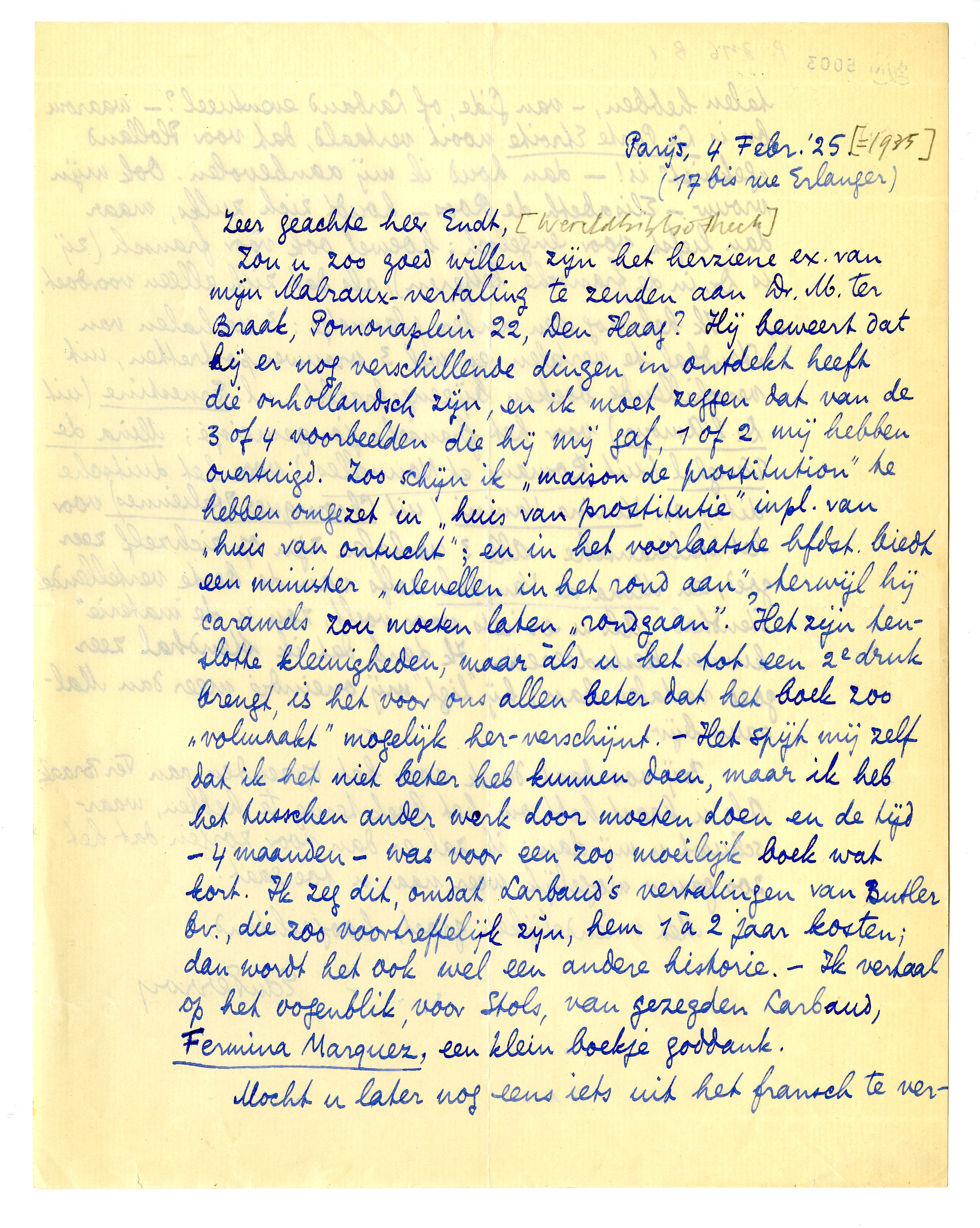 Zou u zoo goed willen zijn het herziene ex. van mijn Malraux-vertaling te zenden aan Dr. M. ter Braak, Pomonaplein 22, Den Haag? Hij beweert dat hij er nog verschillende dingen in ontdekt heeft die onhollandsch zijn, en ik moet zeggen dat van de 3 of 4 voorbeelden die hij mij gaf, 1 of 2 mij hebben overtuigd. Zoo schijn ik ‘maison de prostitution’ te hebben omgezet in ‘huis van prostitutie’ inpl. van ‘huis van ontucht’; en in het voorlaatste hfdst. biedt een minister ‘ulevellen in het rond aan’ terwijl hij caramels zou moeten laten ‘rondgaan’. Het zijn tenslotte kleinigheden, maar àls u het tot een 2e druk brengt is het voor ons allen beter dat het boek zoo ‘volmaakt’ mogelijk her-verschijnt. - Het spijt mij zelf dat ik het niet beter heb kunnen doen, maar ik heb het tusschen ander werk door moeten doen en de tijd - 4 maanden - was voor een zoo moeilijk boek wat kort. Ik zeg dit, omdat Larbaud's vertalingen van Butler bv., die zoo voortreffelijk zijn, hem 1 à 2 jaar kosten; dan wordt het ook wel een andere historie. - Ik vertaal op het oogenblik, voor Stols, van gezegden Larbaud, Fermina Marquez, een klein boekje goddank.