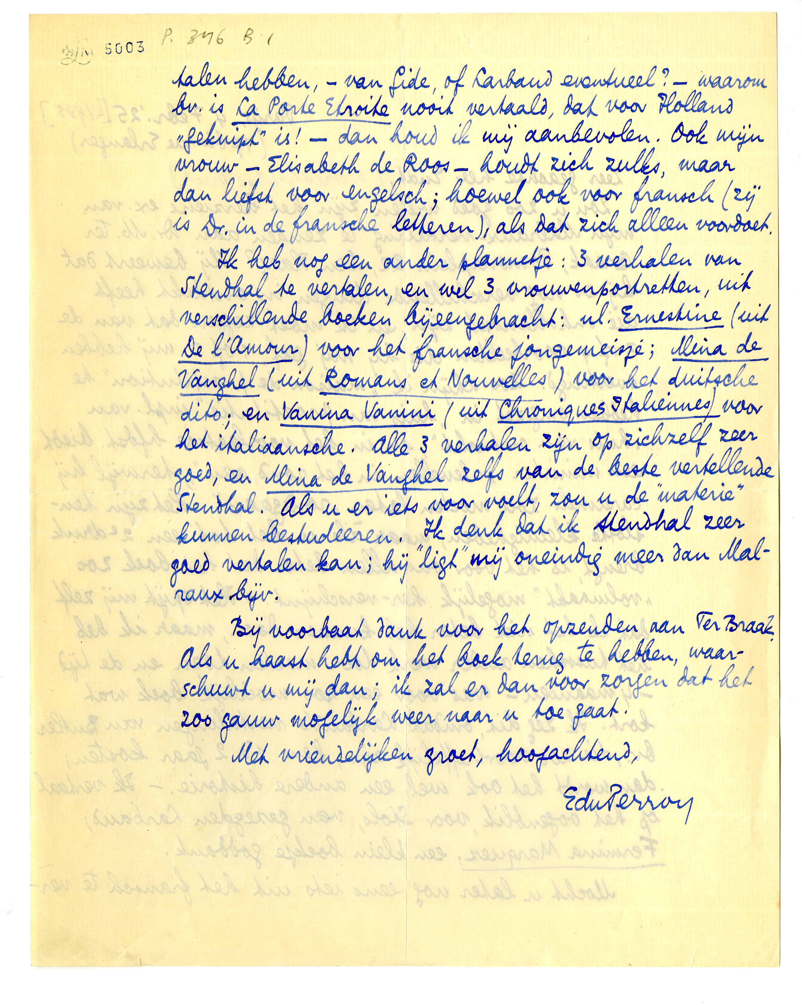 Ik heb nog een ander plannetje: 3 verhalen van Stendhal te vertalen, en wel 3 vrouwenportretten, uit verschillende boeken bijeengebracht: nl. Ernestine (uit De l'Amour) voor het fransche jongemeisje; Mina de Vanghel (uit Romans et Nouvelles) voor het duitsche dito; en Vanina Vanini (uit Chroniques Italiennes) voor het italiaansche.3547 Alle 3 verhalen zijn op zichzelf zeer goed, en Mina de Vanghel zelfs van de beste vertellende Stendhal. Als u er iets voor voelt, zou u de ‘materie’ kunnen bestudeeren. Ik denk dat ik Stendhal zeer goed vertalen kan; hij ‘ligt’ mij oneindig meer dan Malraux bijv.