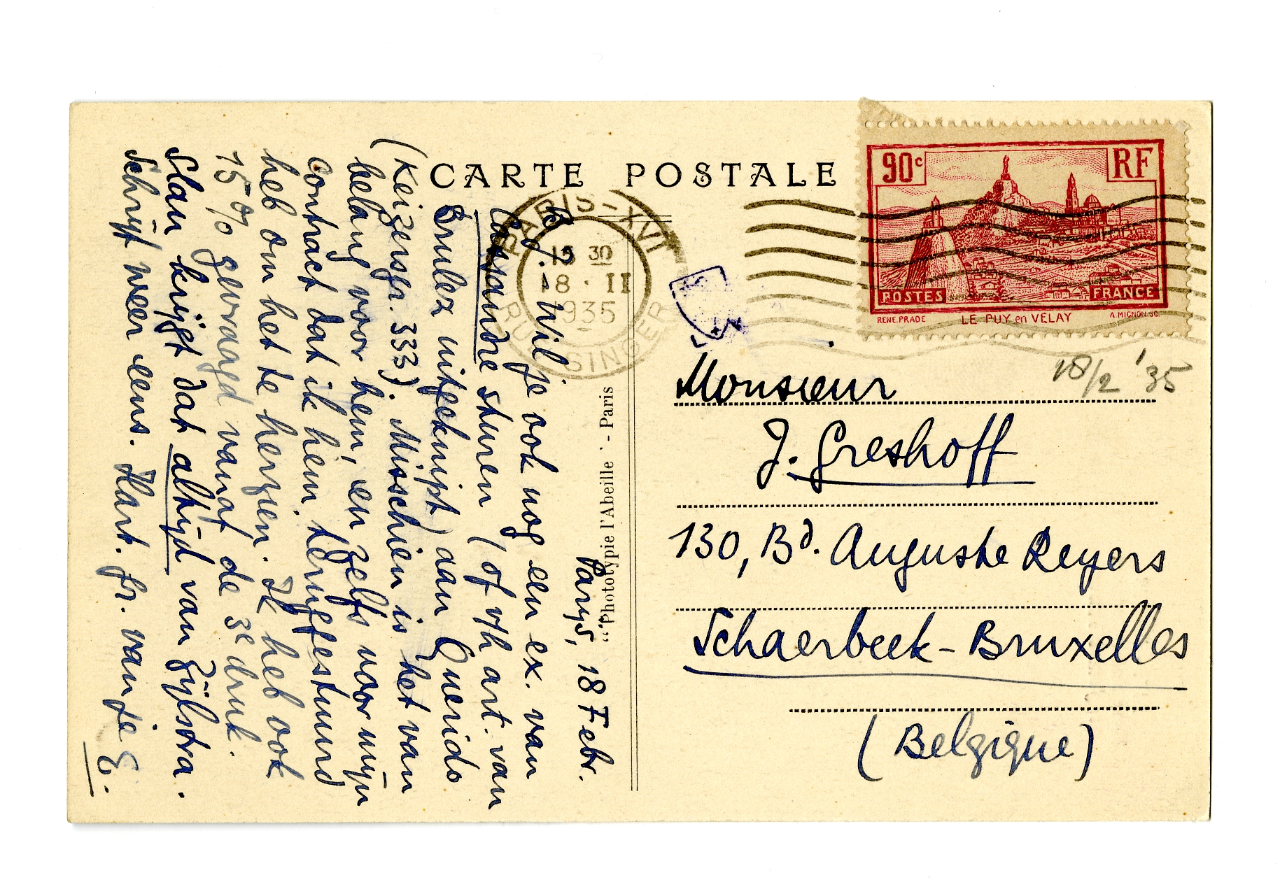 B.J. - Wil je ook nog een ex. van Cassandre sturen (of v/h art. van Brulez uitgeknipt) aan Querido (Keizersgr. 333). Misschien is het van belang voor hem, en zelfs voor mijn contract dat ik hem teruggestuurd heb om het te herzien. Ik heb ook 15% gevraagd vanaf de 3e druk. Slau krijgt dat altijd van Zijlstra. Schrijf weer eens. Hart. gr. van je