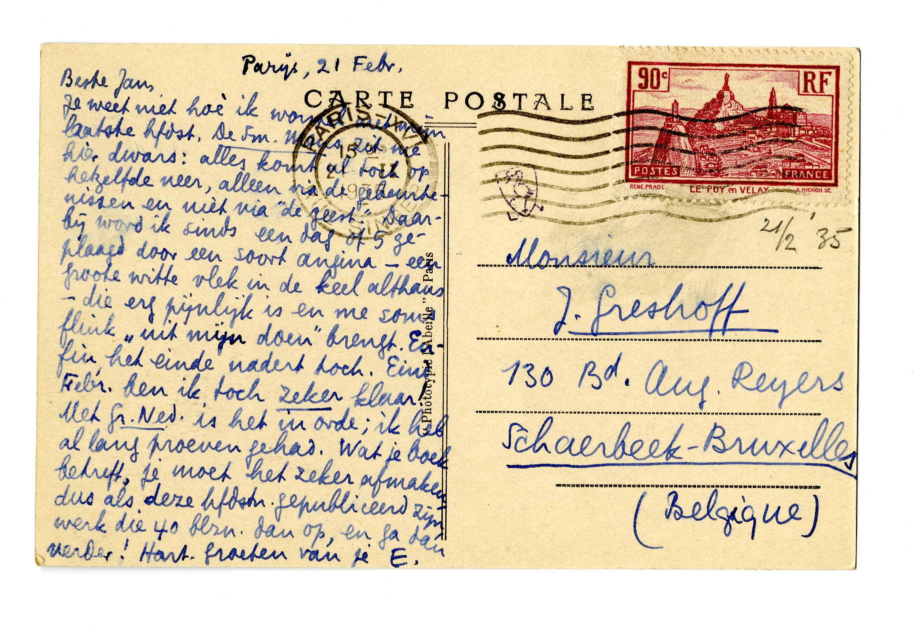 Je weet niet hoè ik worstel met mijn laatste hfdst. De Sm. Mens zit me hier dwars: alles komt nl. toch op hetzelfde neer, alleen via de gebeurtenissen en niet via ‘de geest’. Daarbij word ik sinds een dag of 5 geplaagd door een soort angina - een groote witte vlek in de keel althans - die erg pijnlijk is en me soms flink ‘uit mijn doen’ brengt. Enfin, het einde nadert toch. Eind Febr. ben ik toch zeker klaar! Met Gr. Ned. is het in orde; ik heb al lang proeven gehad. Wat je boek betreft, je moet het zeker afmaken, dus als deze hfdstn. gepubliceerd zijn, werk die 40 blzn. dan op, en ga dan verder! Hart. groeten van je