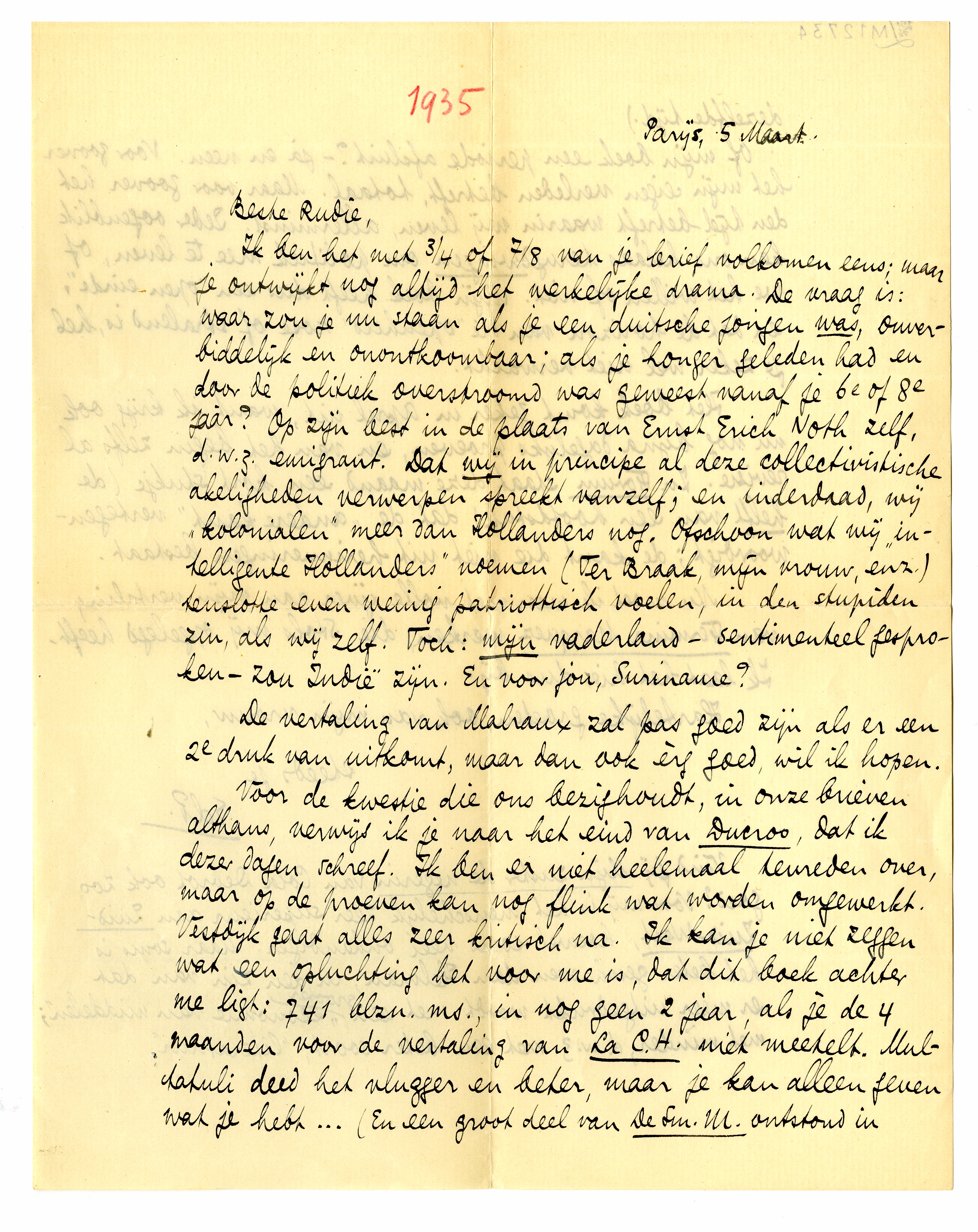 Ik ben het met 3/4 of 7/8 van je brief volkomen eens; maar je ontwijkt nog altijd het werkelijke drama. De vraag is: waar zou je nu staan als je een duitsche jongen was, onverbiddelijk en onontkoombaar; als je honger geleden had en door de politiek overstroomd was geweest vanaf je 6e of 8e jaar? Op zijn best in de plaats van Ernst Erich Noth zelf, d.w.z. emigrant. Dat wij in principe al deze collectivistische akeligheden verwerpen spreekt vanzelf; en inderdaad, wij ‘kolonialen’ meer dan Hollanders nog. Ofschoon wat wij ‘intelligente Hollanders’ noemen (Ter Braak, mijn vrouw, enz.) tenslotte even weinig patriottisch voelen, in den stupiden zin, als wij zelf. Toch: mijn vaderland - sentimenteel gesproken - zou Indië zijn. En voor jou, Suriname?