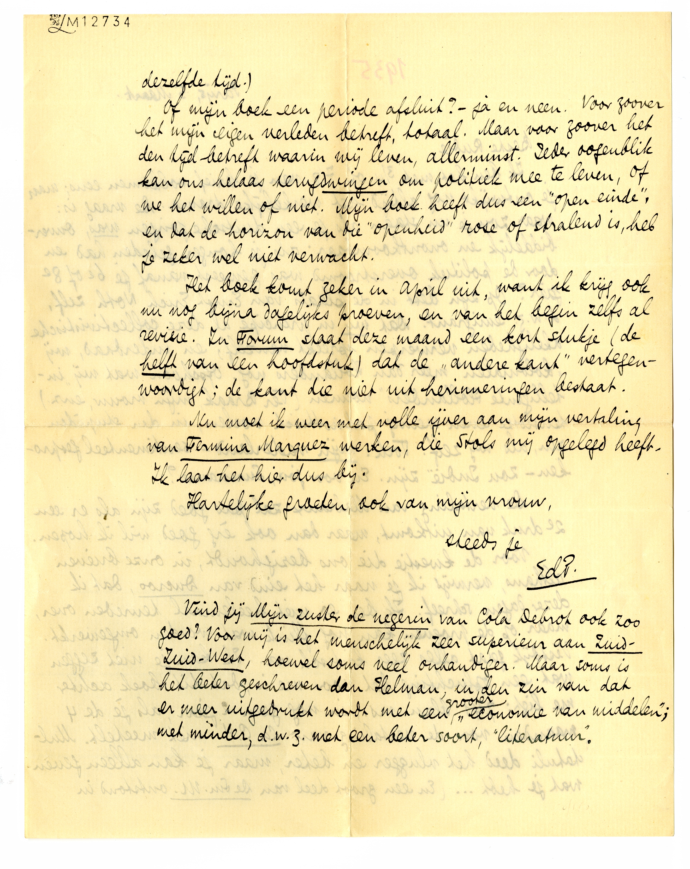 Vind je Mijn zuster de negerin van Cola Debrot ook zoo goed? Voor mij is het menschelijk zeer superieur aan Zuid-Zuid-West, hoewel soms veel onhandiger. Maar soms is het beter geschreven dan Helman, in den zin van dat er meer uitgedrukt wordt met een grooter ‘economie van middelen’, met minder, d.w.z. met een beter soort, ‘literatuur’.