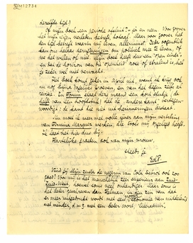 Voor de kwestie die ons bezighoudt, in onze brieven althans, verwijs ik je naar het eind van Ducroo, dat ik dezer dagen schreef. Ik ben er niet heelemaal tevreden over, maar op de proeven kan nog flink wat worden omgewerkt. Vestdijk gaat alles zeer kritisch na. Ik kan je niet zeggen wat een opluchting het voor me is, dat dit boek achter me ligt: 741 blzn. ms., in nog geen 2 jaar, als je de 4 maanden voor de vertaling van La C.H. niet meetelt. Multatuli deed het vlugger en beter, maar je kan alleen geven wat je hebt... (En een groot deel van De Sm. M. ontstond in dezelfde tijd.)
