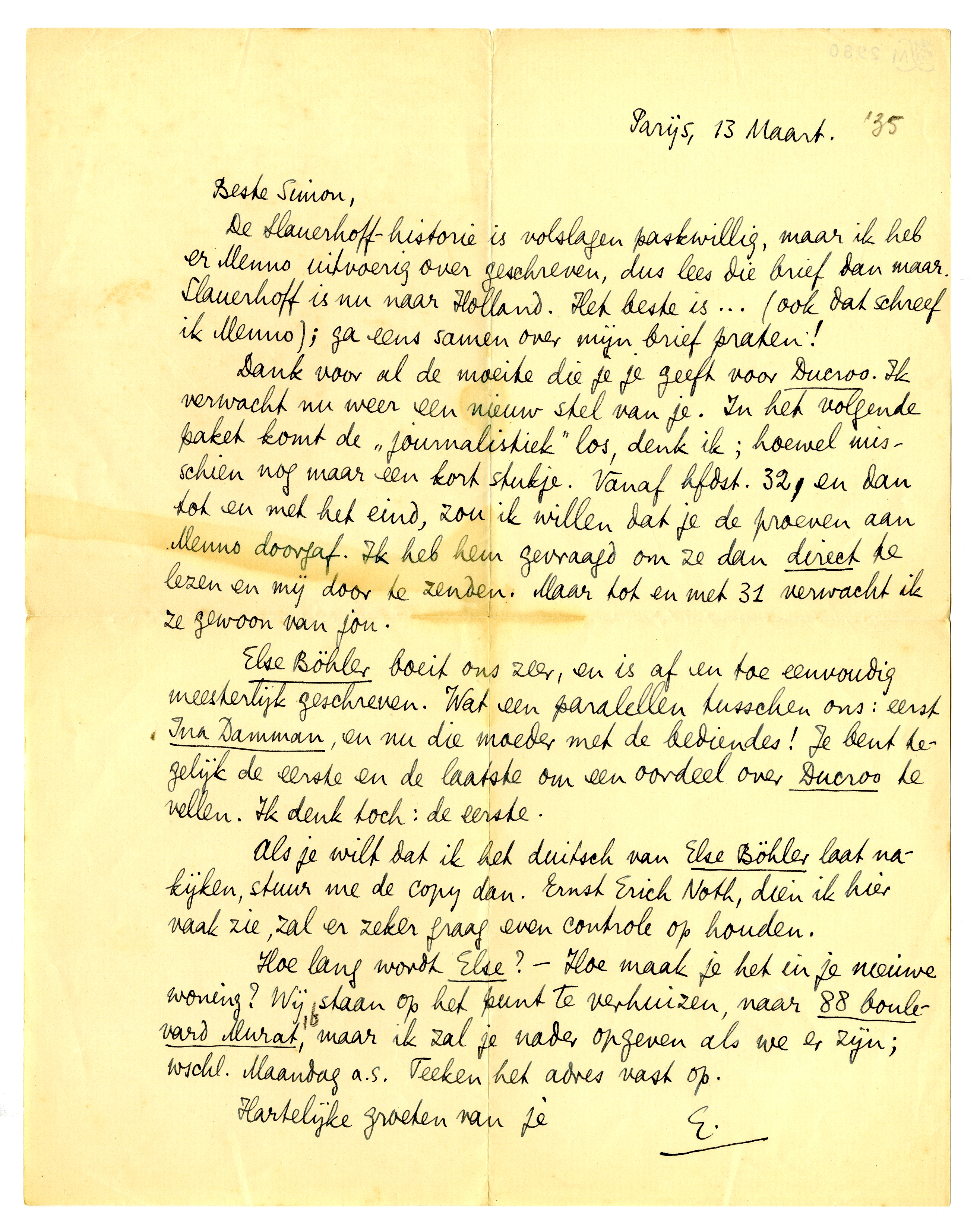 Als je wilt dat ik het duitsch van Else Böhler laat nakijken, stuur me de copy dan. Ernst Erich Noth, dien ik hier vaak zie, zal er zeker graag even controle op houden.