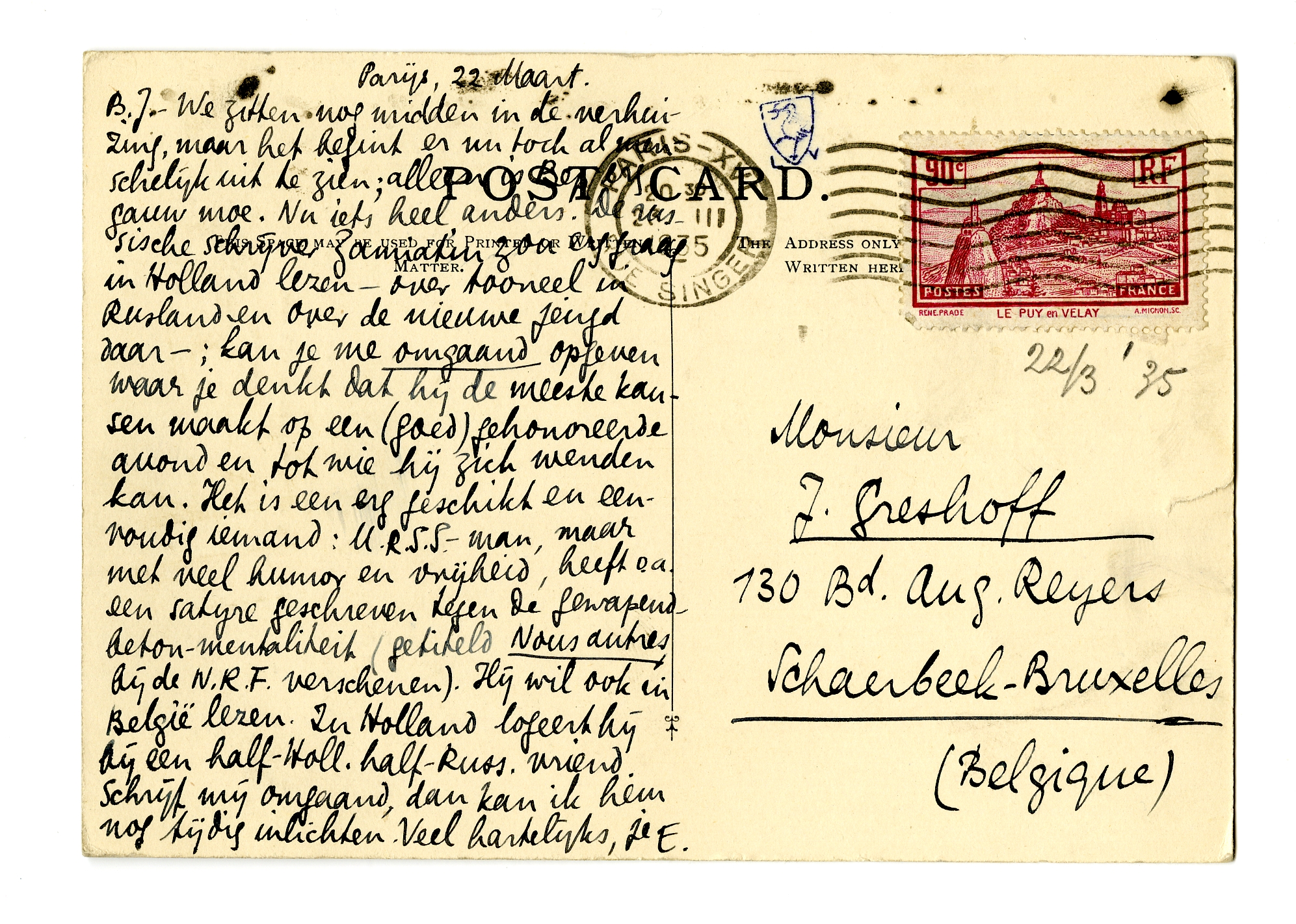 B.J. - We zitten nog midden in de verhuizing, maar het begint er nu toch al menschelijk uit te zien; alleen is Bep erg gauw moe. Nu iets heel anders. De russische schrijver Zamiatin3596 zou erg graag in Holland lezen - over tooneel in Rusland en over de nieuwe jeugd daar -; kan je me omgaand opgeven waar je denkt dat hij de meeste kansen maakt op een (goed) gehonoreerde avond en tot wie hij zich wenden kan. Het is een erg geschikt en eenvoudig iemand: U.R.S.S.-man, maar met veel humor en vrijheid, heeft o.a. een satyre geschreven tegen de gewapend-beton-mentaliteit (getiteld Nous autres, bij de N.R.F. verschenen). Hij wil ook in België lezen. In Holland logeert hij bij een half-Holl. half-Russ. vriend. Schrijf mij omgaand, dan kan ik hem nog tijdig inlichten. Veel hartelijks, je