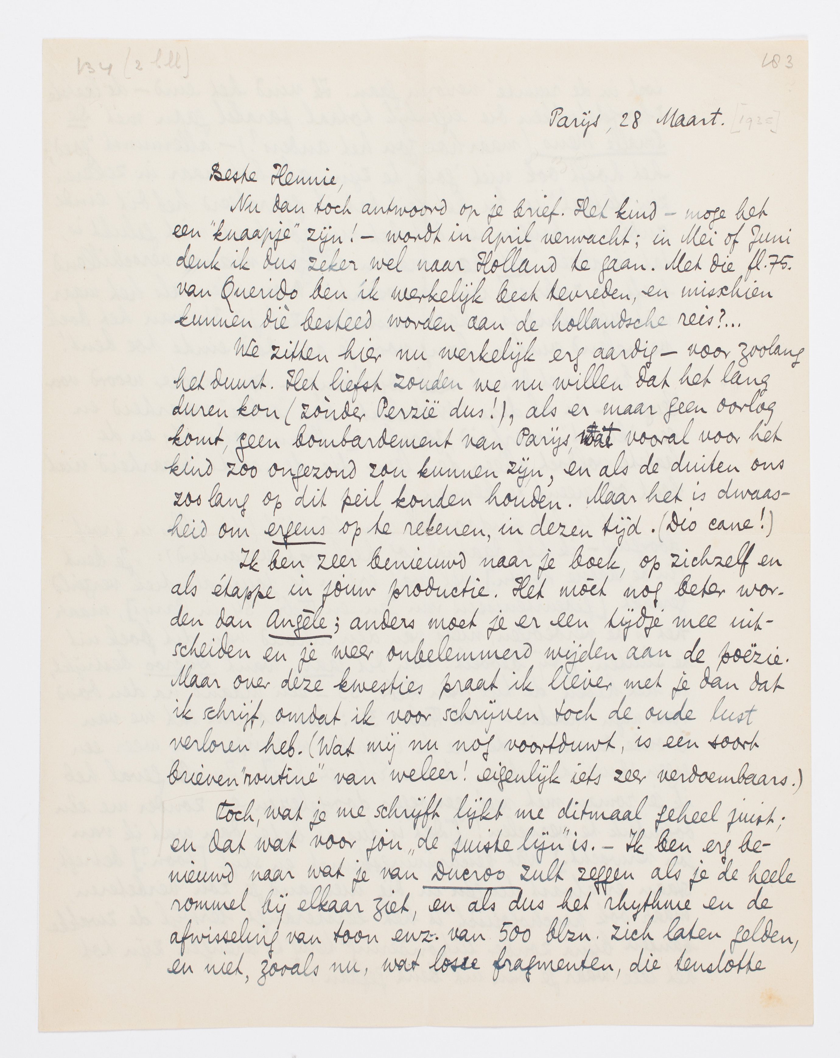 Nu dan toch antwoord op je brief. Het kind - moge het een ‘knaapje’ zijn! - wordt in April verwacht; in Mei of Juni denk ik dus zeker wel naar Holland te gaan. Met die fl. 75. van Querido ben ik werkelijk best tevreden, en misschien kunnen diè besteed worden aan de hollandsche reis?...